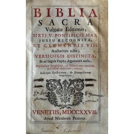 Biblia Sacra vulgatae editionis, Sixti V Pontificis Max. Jussu recognita, et Clementis VIII. Auctoritate edita; Versiculis distincta, et ad singula Capita Argumentis aucta; Pluribusque imaginibus, ad historiarum notitiam politissime elaboratis, ornata; Indiceque Epistolarum, et Evangeliorum locupletata