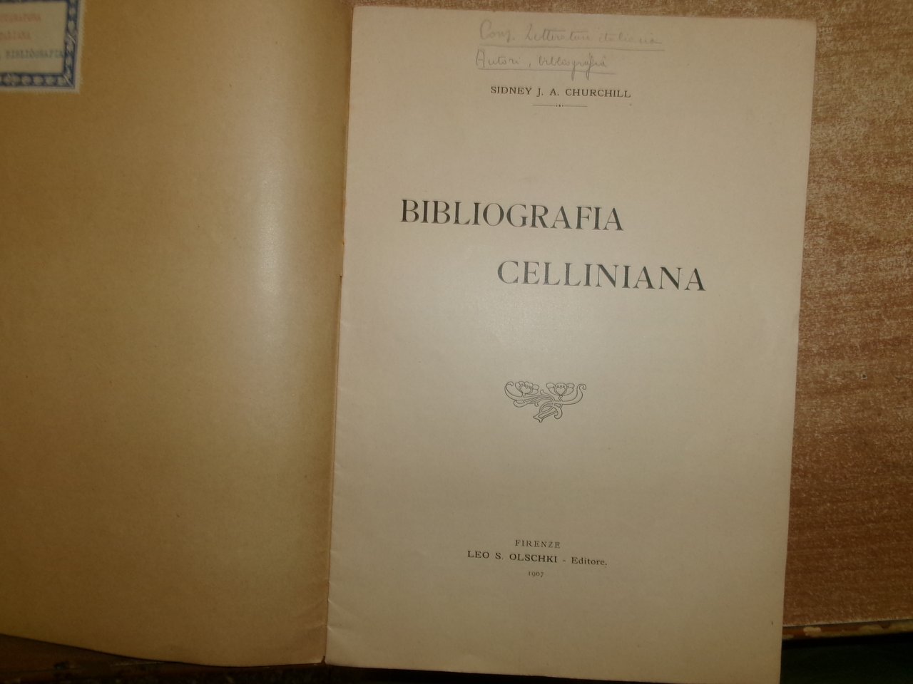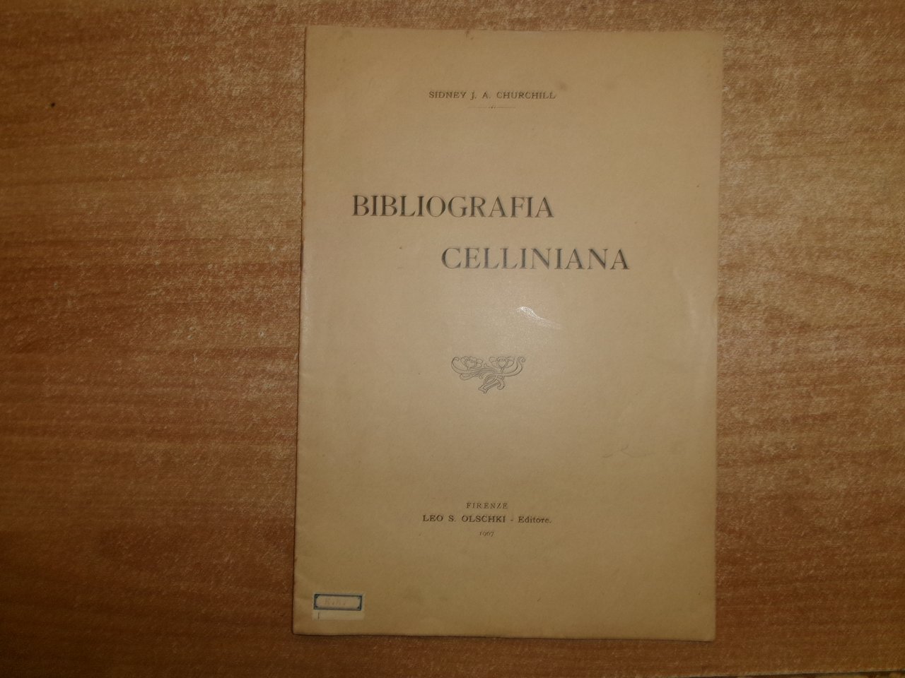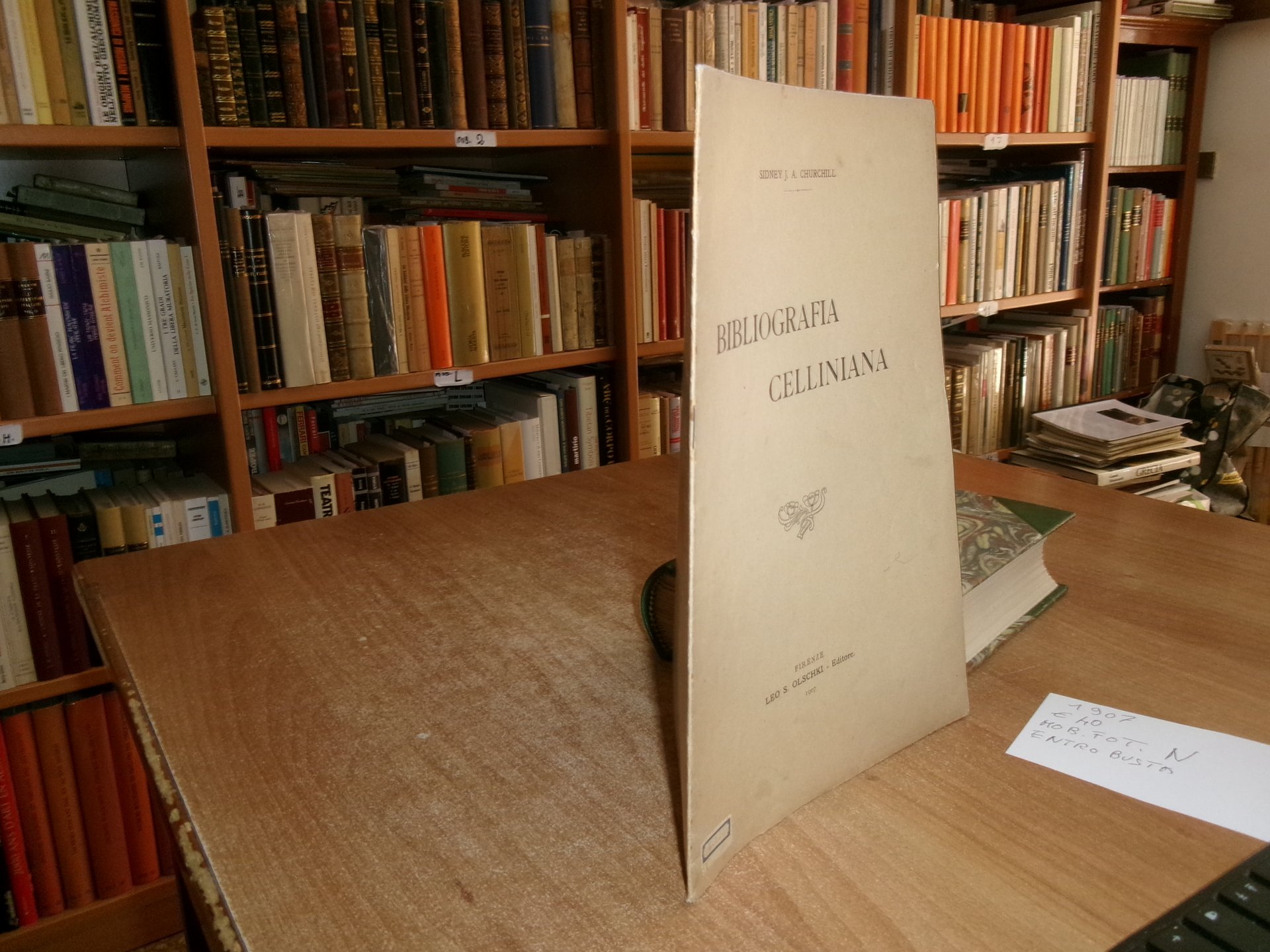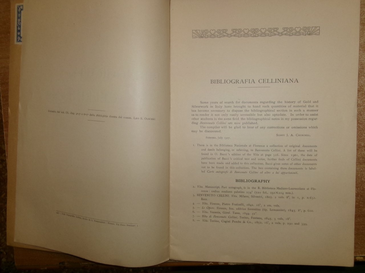 BIBLIOGRAFIA CELLINIANA. Sidney J. A. Churchil. Firenze, Leo S. Olschki Editore, 1907. In-8° grande, br. con punto metallico. 15 pp. Raro opuscolo ben conservato. Neg. fot. mob. N entro busta trasp.