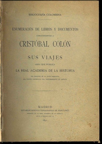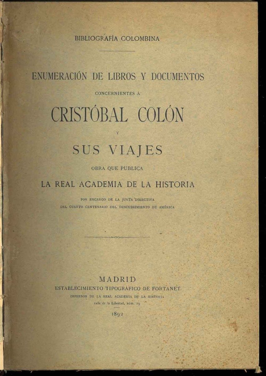 Bibliografìa colombina. Enumeraciòn de libros y documentos concernientes à Cristobal Colòn y sus viajes. Obra que publica la real academia de la historia por encargo de la junta directiva del cuarto centenario del descrubimiento de América.