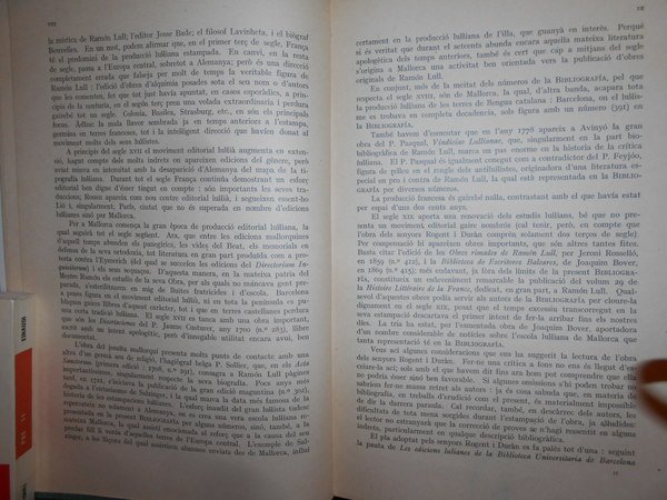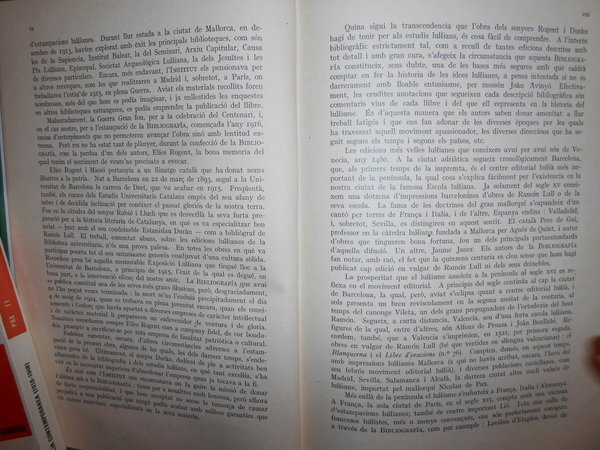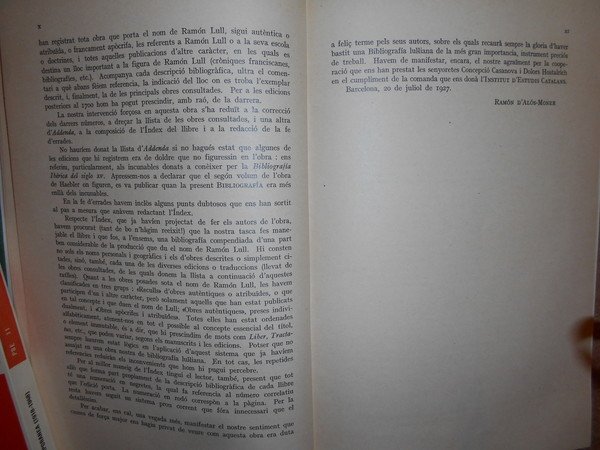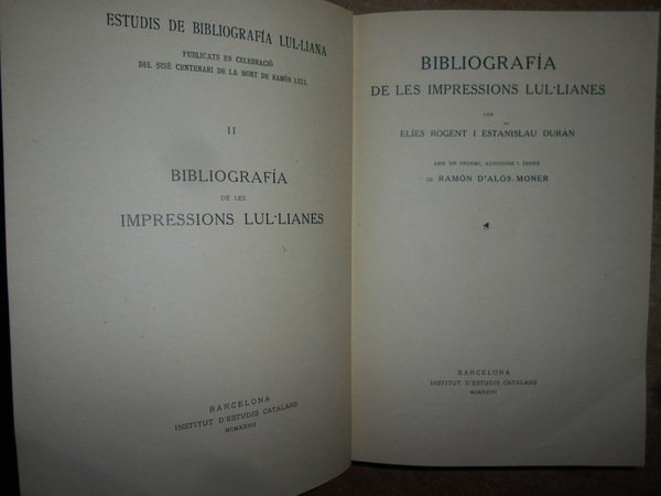 Ramon d' Alos-Moner. Barcelona, Institut D' Estudios Catalans, 1927. BIBLIOGRAFIA de les Impressions LUL.LIANES per Elies Rogent i Estanislau Duràn. Amb un proemi, addicions i index. In-8° tela verde con titolo in oro entro tassello al dorso. xi, 406 pp. Perfetto esemplare. Uff. D. III - 2
