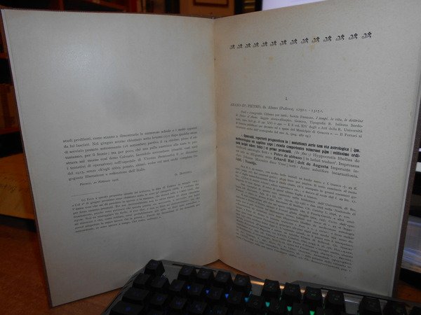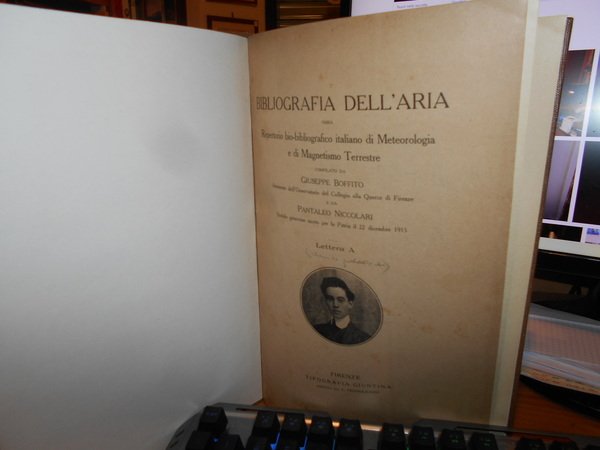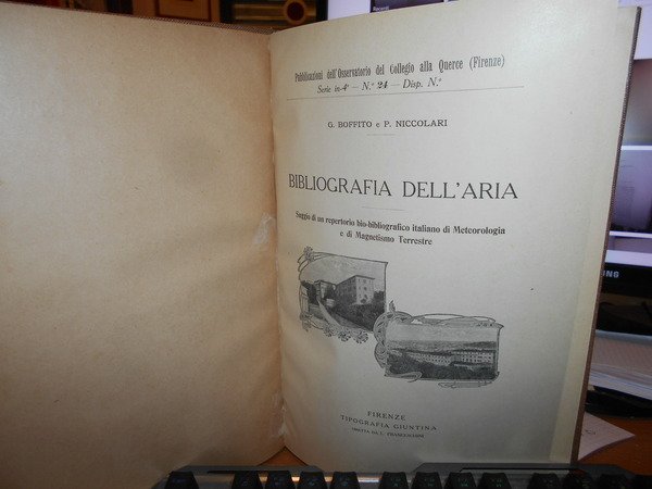 G. Boffito e P. Niccolari. Firenze, Tipografia Giuntina, 1916. Bibliografia dell' Aria. Saggio di un repertorio bio-bibliografico italiano di Meteorologia e di Magnetismo Terrestre. Lettera A (unico pubblicato). In-4° piccolo, tela con titolo in oro entro tassello al dorso, brossure originali conservate. (iii), 152 pp. Ottimo esemplare in legatura recente con le brossure originali conservate. Uff. B - III - 3