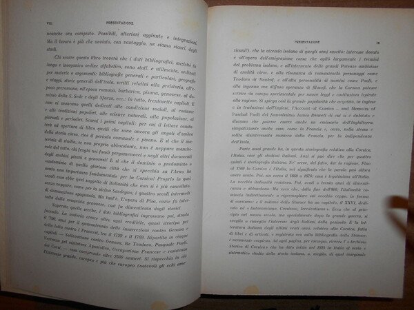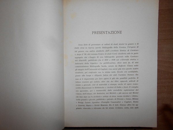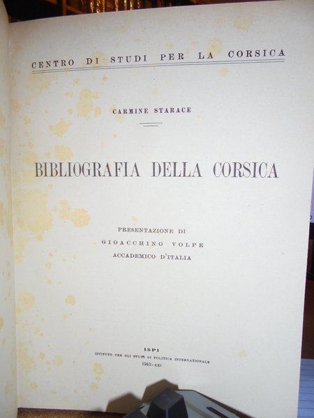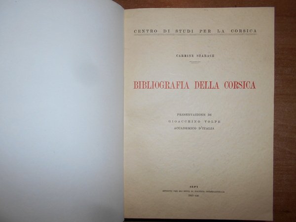 CARMINE STARACE. Isola del Liri, con i tipi della Società A. Macioce & Pisani, 1943. BIBLIOGRAFIA DELLA CORSICA. Edizione originale. In-8° grande, tela con titolo in oro entro tassello al dorso. xvi, 1033 pp. Ottimo esemplare in legatura recente con le copertine originali conservate. Tenui macchioline nella prima bianca e nel margine sinistro del frontespizio. Uff. E - IV - 5 - 2