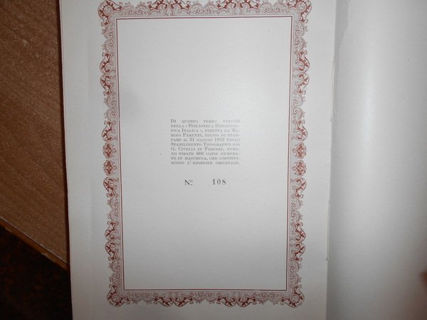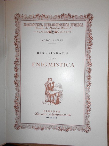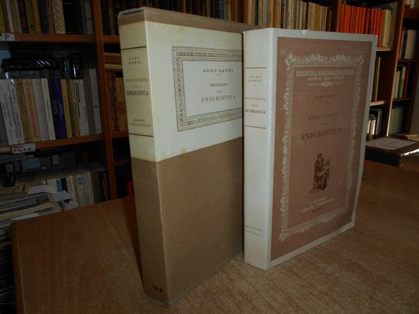 ALDO, SANTI. Firenze, Sansoni Antiquariato, 1952. Bibliografia della ENIGMISTICA. In-8°, cart. edit. con sovracopertina. 393, (2) pp. con illustrazioni nel testo e tavole fuori testo. Ottimo esemplare non rifilato in tiratura limitata di 666 copie (n° 108). Conservato nell' astuccio originale. Uff. E - I - 6 - 2