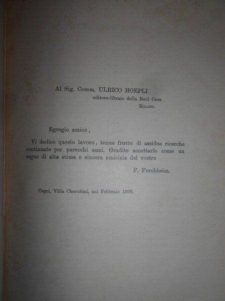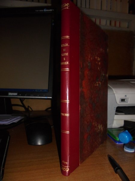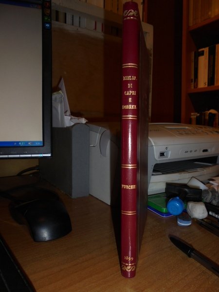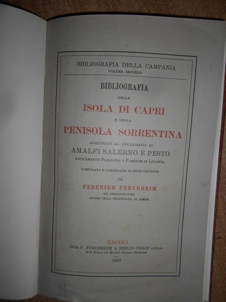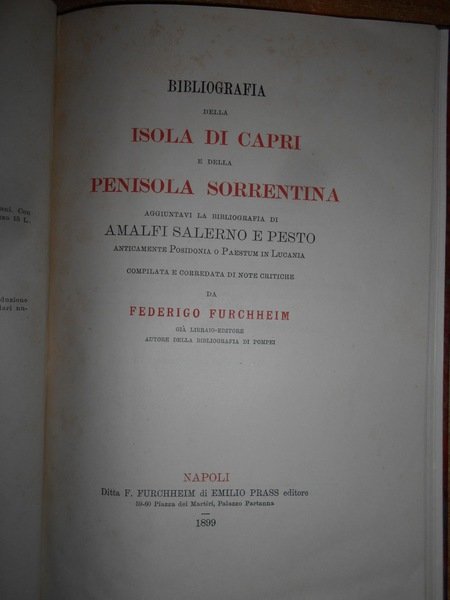 Federigo, Furcheim. Napoli, Ditta Furcheim di Emilio Prass, 1899. BIBLIOGRAFIA della Isola di Capri e della Penisola Sorrentina aggiuntavi la Bibliografia di Amalfi Salerno e Pesto. In-8°, m. pelle con titolo e fregi in oro al dorso, copertine originali conservate. (5), 86, (1) pp. Ottimo esemplare con le brossure originali conservate. Uff. E - IV - 4