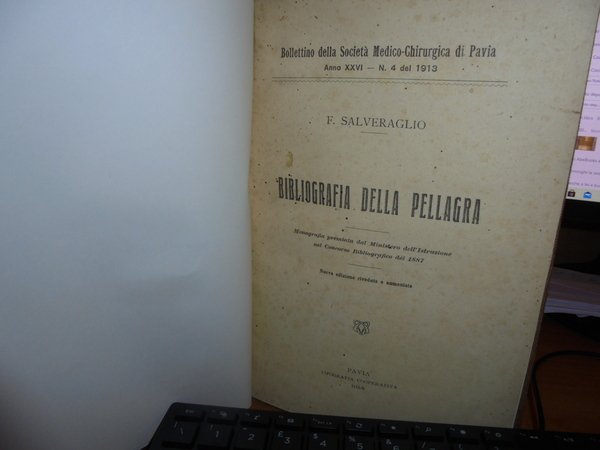 F. SALVERAGLIO. Pavia, Tipografia Cooperativa, 1914. BIBLIOGRAFIA DELLA PELLAGRA. Monografia premiata dal Ministero dell' Istruzione nel concorso Bibliografico del 1887. In-8°, tela con titolo in oro entro tassello al dorso, copertine originali conservate. 189 pp. Ottimo esemplare in prima edizione, legatura recente con le brossure originali conservate. Uff. D - II - 1