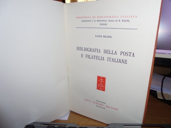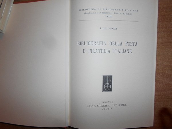 LUIGI PILONI. Firenze, Leo S. Olschki, 1959. BIBLIOGRAFIA DELLA POSTA E FILATELIA ITALIANE. In-8°, tela con titolo in oro entro tassello al dorso. xxii, 396 pp. con XVI tavole fuori testo. Perfetto esemplare in legatura recente con le copertine originali conservate. Uff. E - II - 6 - 2