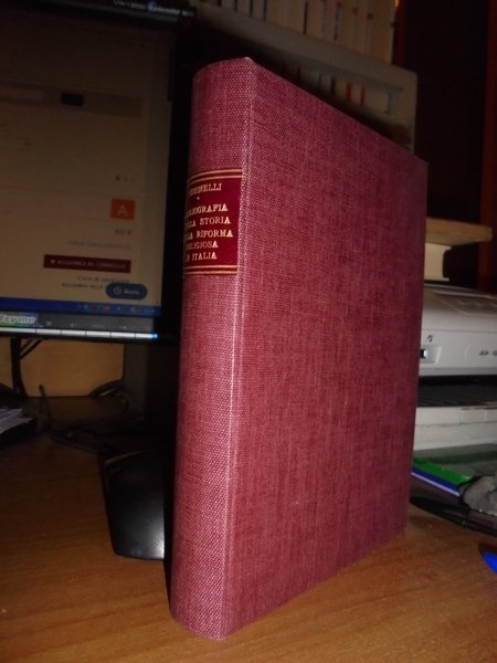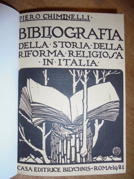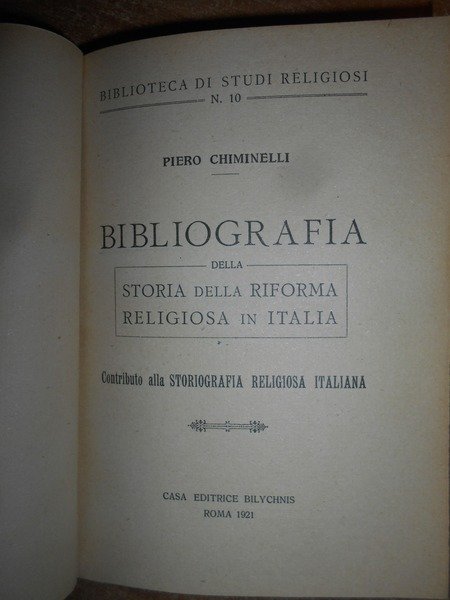 Chiminelli, Piero. Roma, Casa Editrice Bilychnis, 1921. BIBLIOGRAFIA della Storia della Riforma Religiosa in Italia. In-16°, tela con titolo in oro entro tassello al dorso, brossure originali conservate. 301, (viii) pp. Perfetto esemplare in legatura recente con le copertine originali conservate. Uff. F - 6