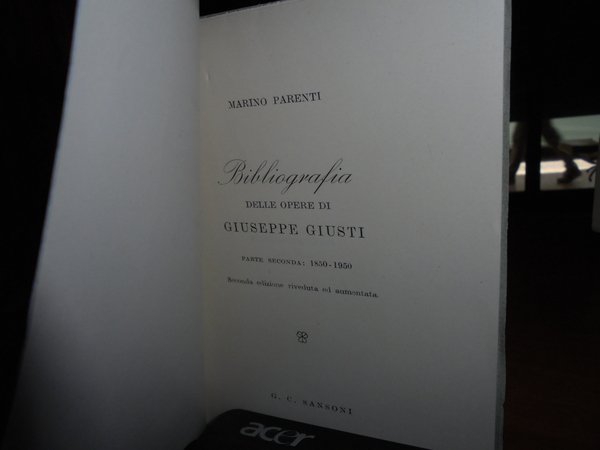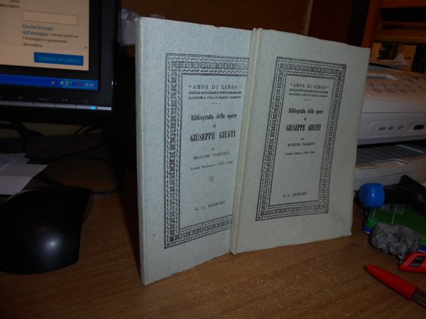 Marino, Parenti. Firenze, G.C. Sansoni, 1951. Bibliografia delle Opere di GIUSEPPE GIUSTI. Seconda edizione riveduta e aumentata. 2 volumi in-16° piccolo, cart. edit. 81, (2) pp.; 87, (6) pp. con riproduzioni nel testo. In ottimo stato di conservazione. Uff. A - II - 3 - 2 entro busta trasp.