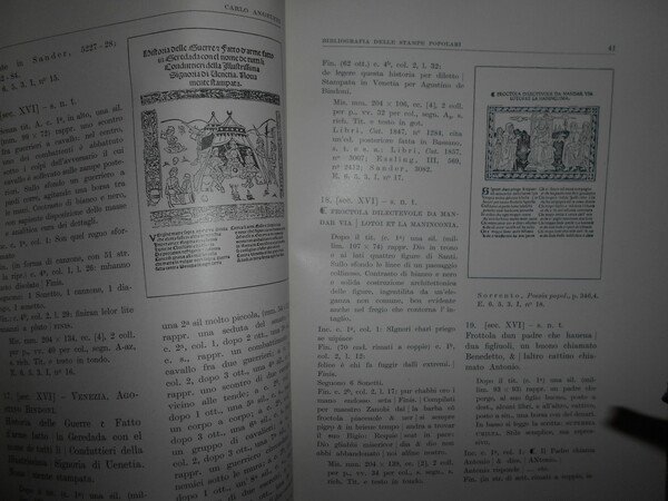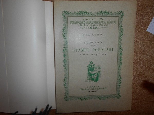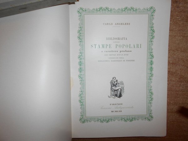 CARLO ANGELERI. Firenze, Sansoni Antiquariato, 1953. Bibliografia delle STAMPE POPOLARI a carattere profano dei Secoli XVI e XVII conservate nella Biblioteca Nazionale di Firenze. In-8° grande, cart. edit. con sovracopertina. 218, (2) pp. con numerose illustrazioni nel testo. In ottimo stato di conservazione a fogli chiusi con astuccio. Uff. B - II - 5 - 2