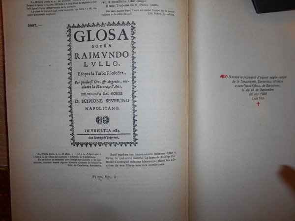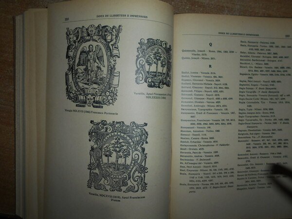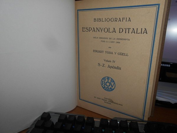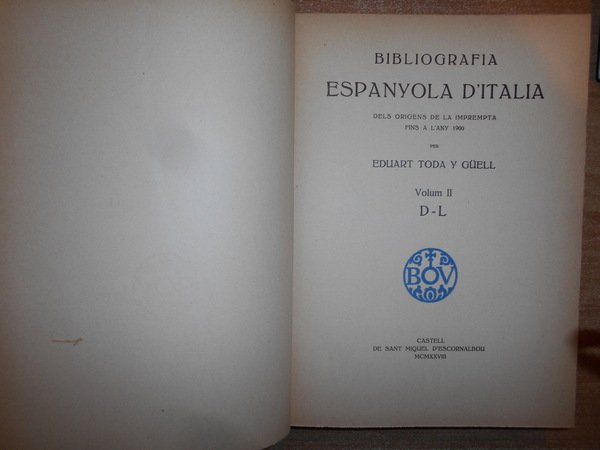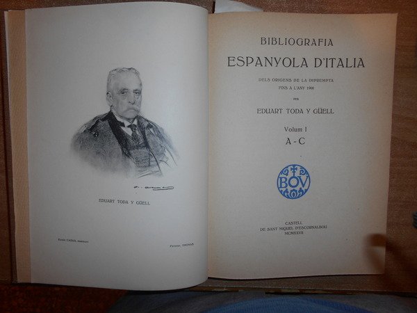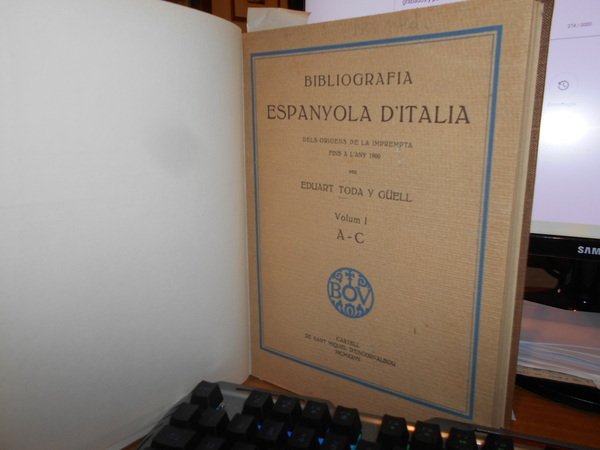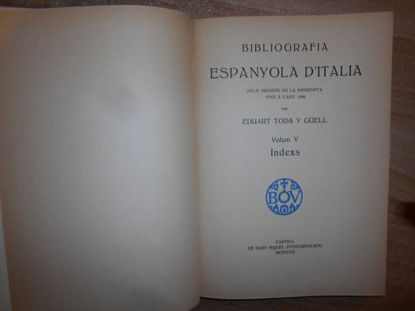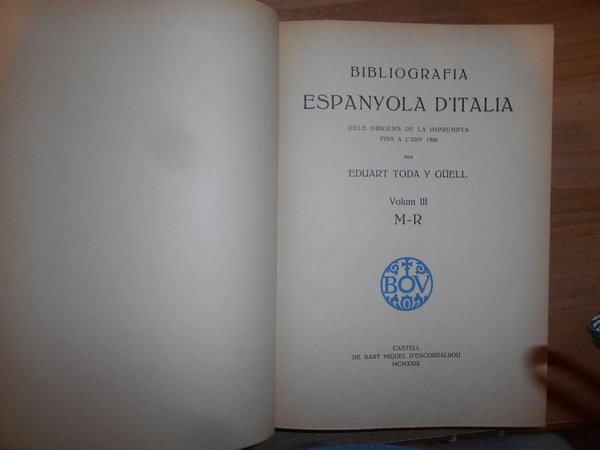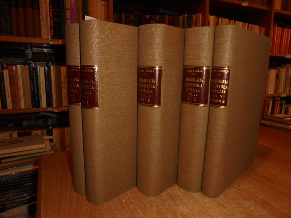 Toda y Güell, Eduart. Castell de Sant Miquel d’Escornalbou, 1927-1931. Bibliografia ESPANYOLA D' ITALIA dels origines de la imprenta fins a l' any 1900. 5 volumi in-8° grande, tela con titoli in oro entro tasselli ai dorsi, copertine originali conservate. vii, 470 pp. con ritratto dell' Autore in antiporta. viii, 506 pp.; viii, 532 pp.; viii, 531 pp.; (4), 300 pp. Profusamente illustrato con riproduzioni di incisioni e copertine di libri. Ottime condizioni. La migliore e più completa bibliografia sui libri spagnoli stampati in Italia. Perfetto esemplare con tutte le copertine originali conservate. Vendibile solo in Italia. Uff. mob. E - III - 5 - 2