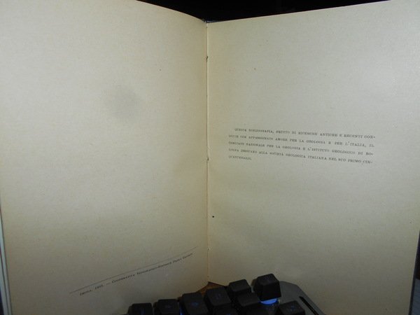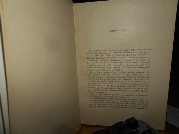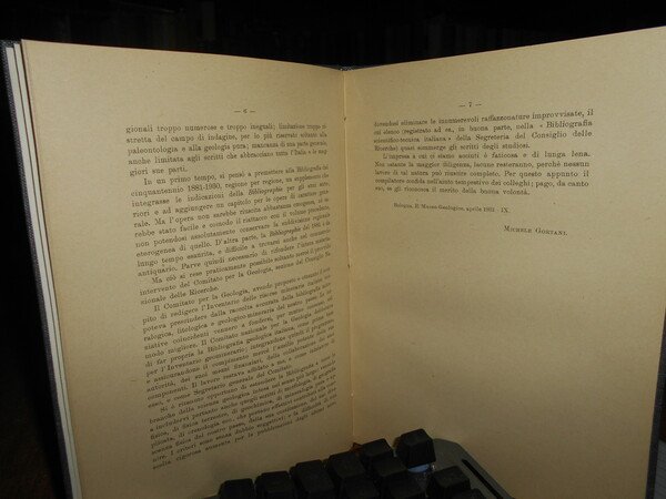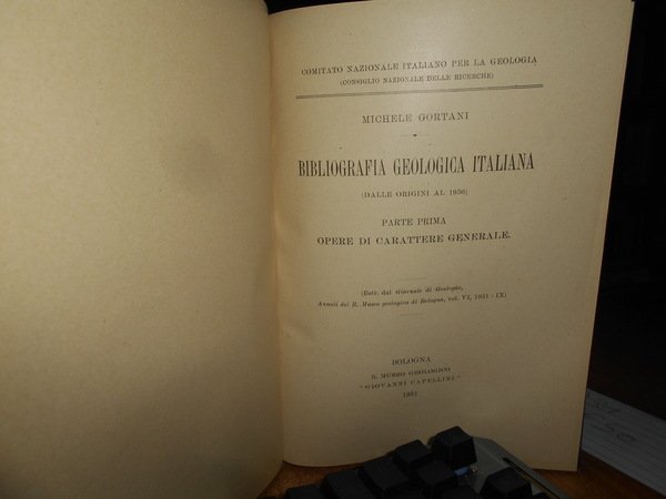MICHELE GORTANI. Bologna, R. Museo Geologico Giovanni Capellini, 1931. Bibliografia Geologica Italiana (Dalle origini al 1930). Parte prima Opere di carattere generale. In-8°, tela con titolo in oro entro tassello al dorso, copertine originali conservate. 100 pp. Perfetto esemplare in legatura recente con le brossure originali conservate. Uff. B - III - 3