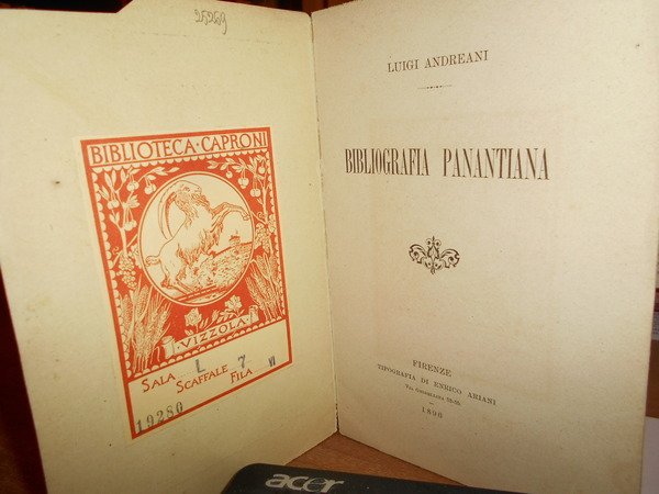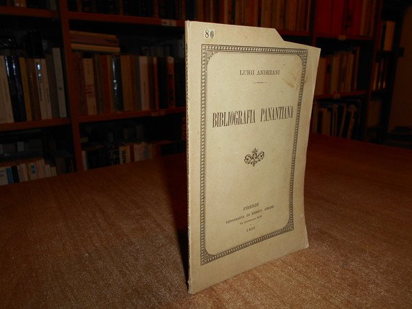 LUIGI, ANDREANI. Firenze, Tipografia di Enrico Ariani, 1896. BIBLIOGRAFIA PANANTIANA. In-16°, br. orig. 34, (1) pp. Raro opuscolo ben conservato con lieve mancanza angolare al piano anteriore. Uff. A - II - 3 - 2