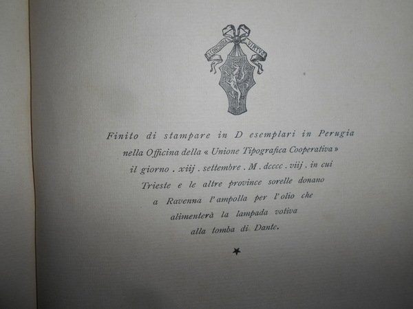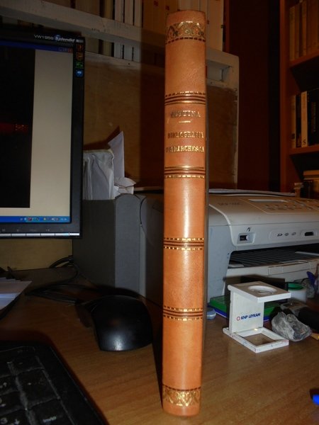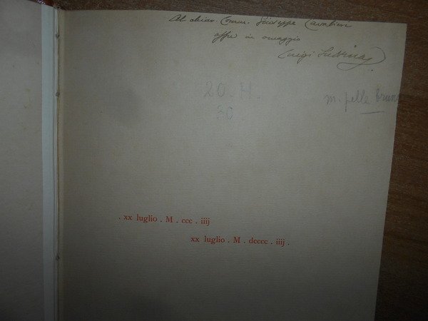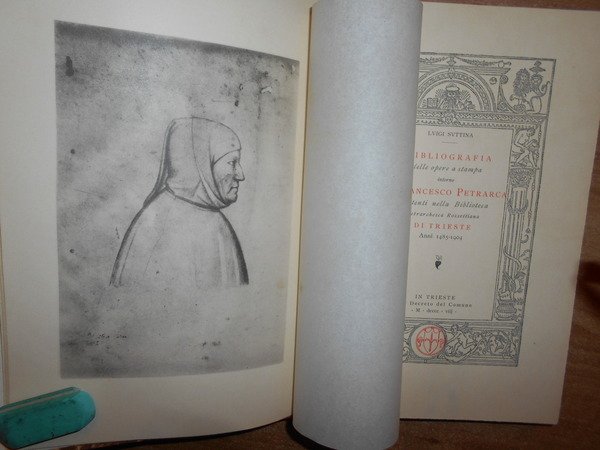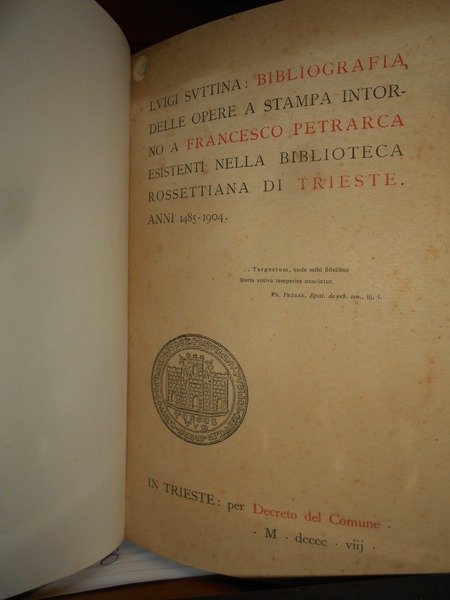 Luigi, Suttina. In Trieste per Decreto del Comune, 1908. BIBLIOGRAFIA PETRARCHESCA. In-8°, m. pelle con fregi e titoli in oro al dorso, copertine originali conservate, dedica con firma dell' Autore all' occhietto. xv, 203, (2) pp. Ottimo esemplare. Uff. E - II - 4 - 2