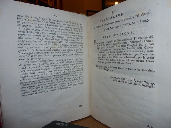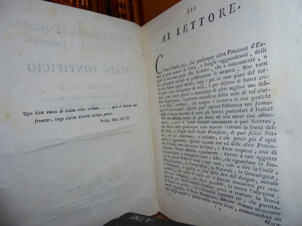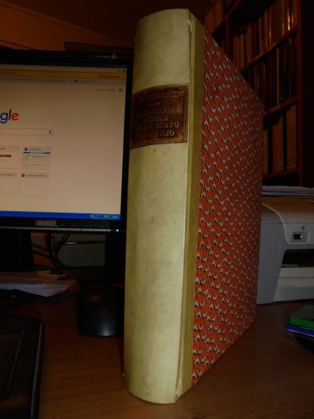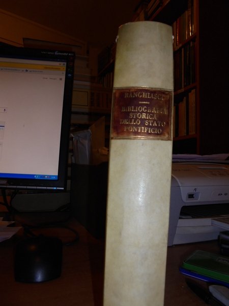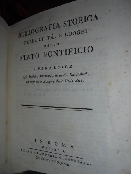 Ranghiasci, Luigi. In Roma, nella Stamperia Giunchiana, 1792. Bibliografia Storica delle città, e luoghi dello Stato Pontificio. Supplemento alla bibliografia Storica delle città, e luoghi dello Stato Pontificio. 2 volumi legati assieme in-8° grande, m-pergamena coeva con titolo in oro entro tassello al dorso. viii, 319, (1) pp.; 92, (2) pp. Il secondo volume è corto di margine in testa. Ottimo esemplare. Cas