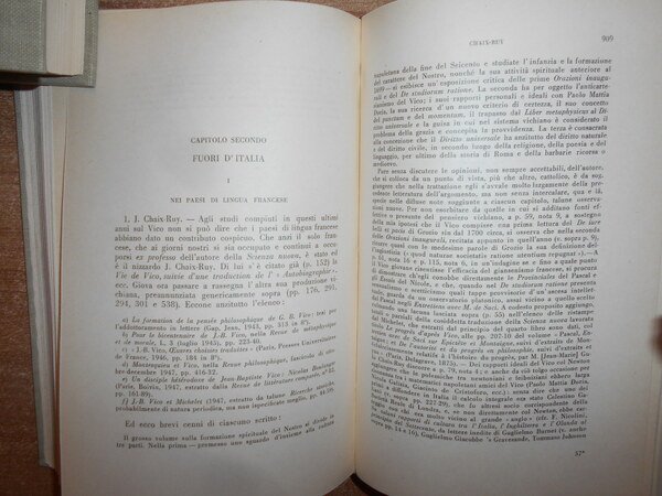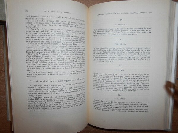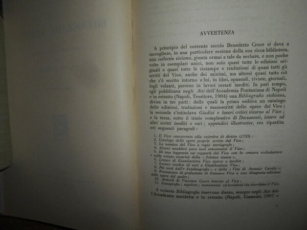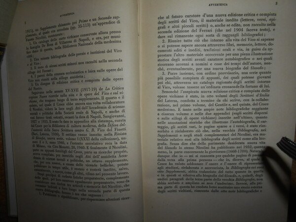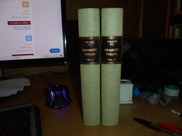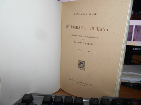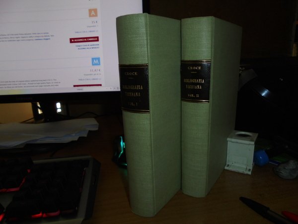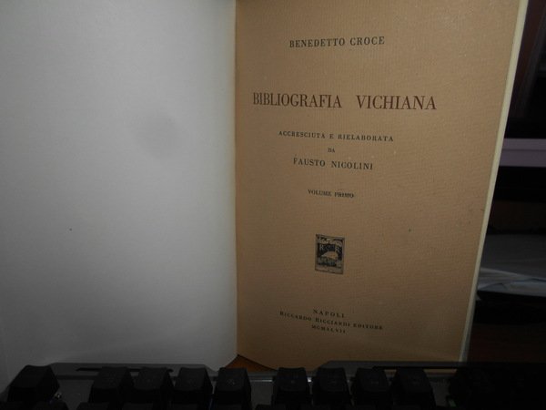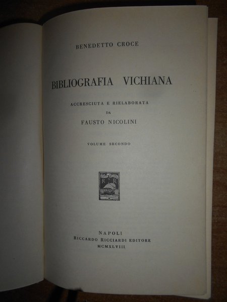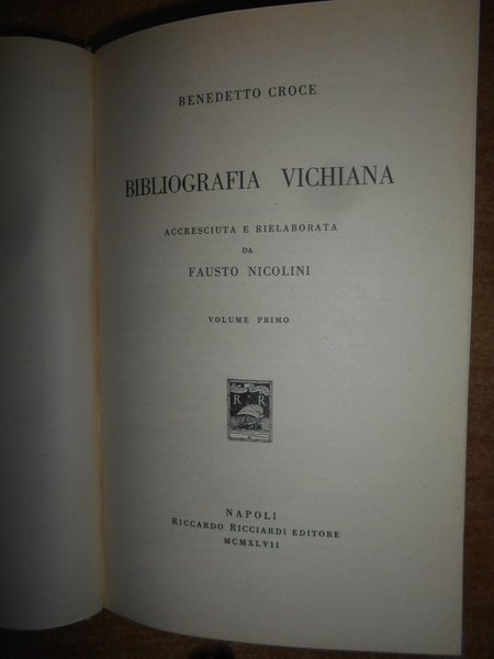 BENEDETTO CROCE. Napoli, Riccardo Ricciardi Editore, 1948. BIBLIOGRAFIA VICHIANA accresciuta e rielaborata da Fausto Nicolini. 2 volumi in-8° piccolo, tela verde chiaro con titoli in oro entro tasselli ai dorsi, copertine originali conservate. Complessive 1051 pp. (numerazione pagine continua). Perfetto stato di conservazione in legatura anni '70 con tutte le copertine originali conservate. Uff. D - II - 5 - 2