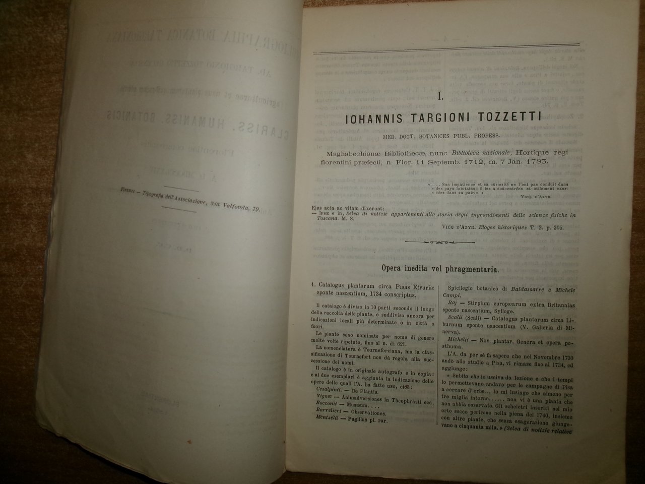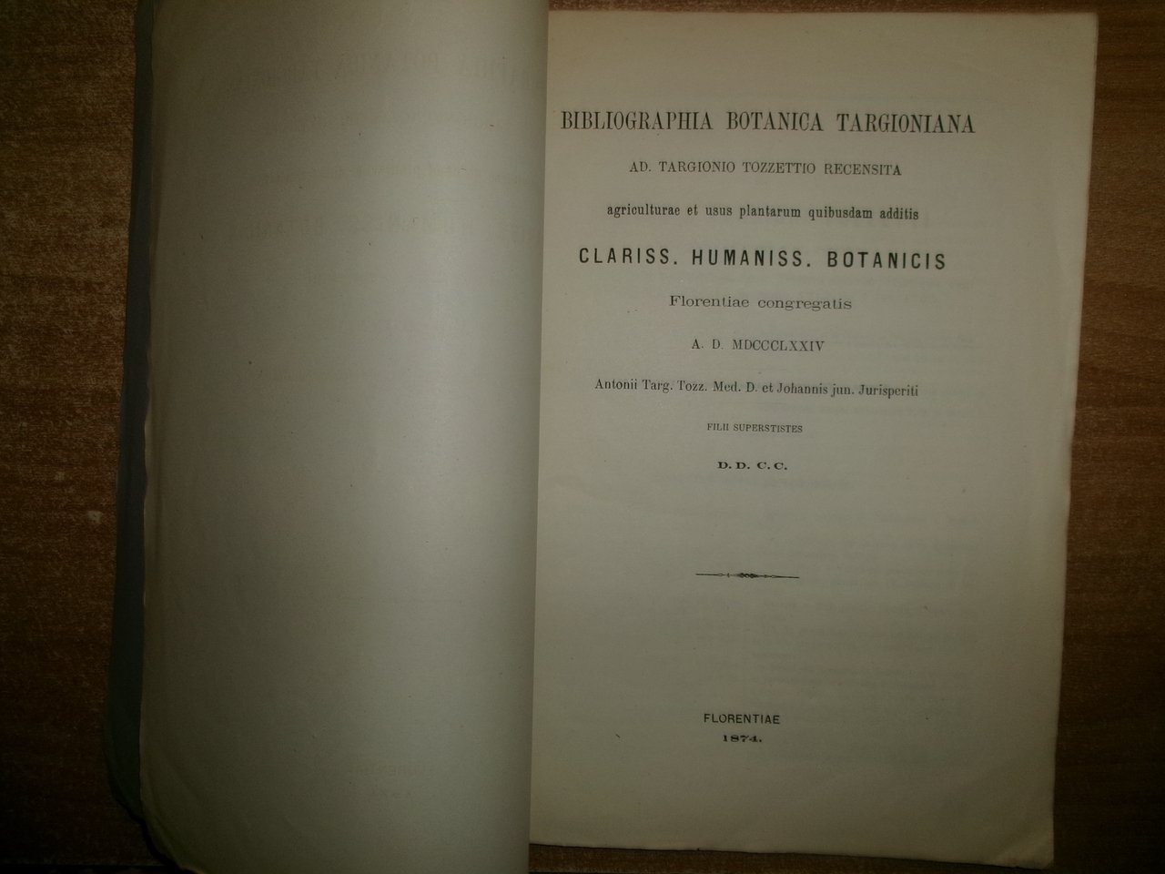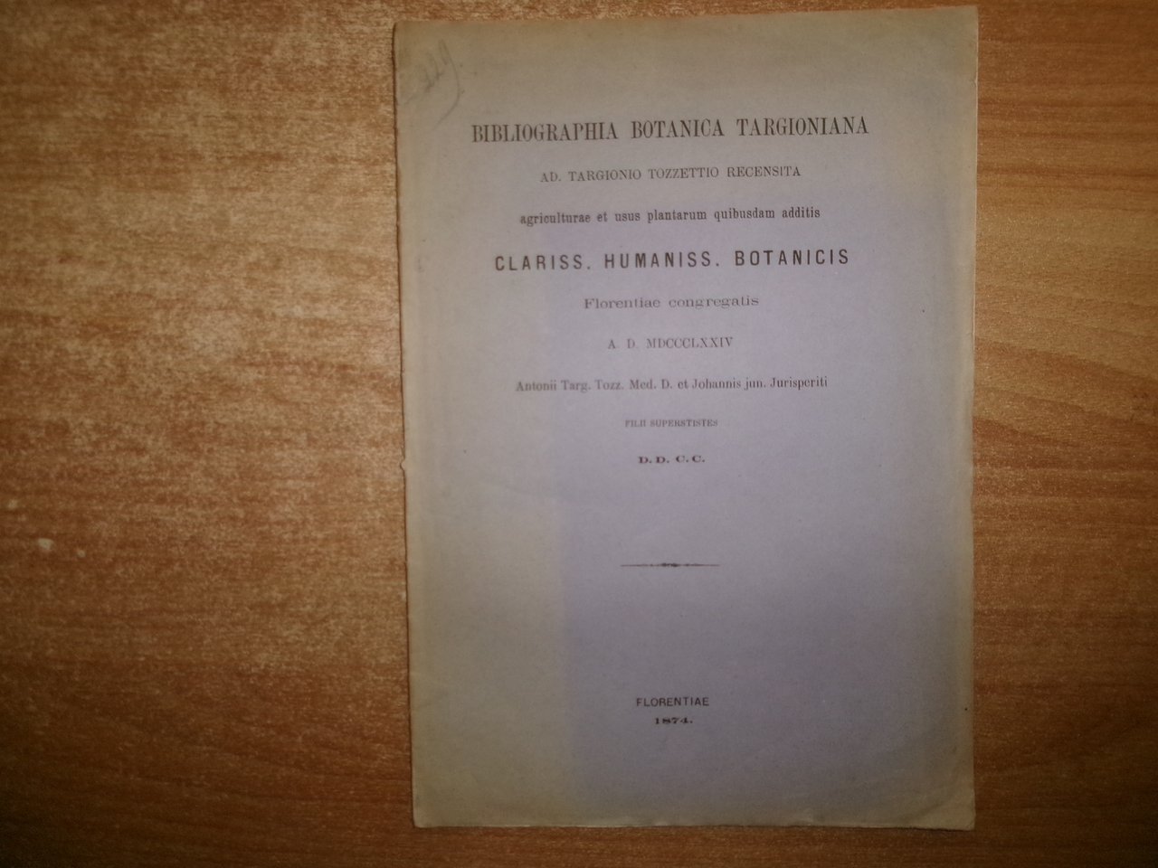 BIBLIOGRAPHIA BOTANICA TARGIONATA Ad. TARGIONIO TOZZETTIO RECENSITA Agriculturare et usus plantarum quibusdam additis... CLARISS. HUMANISS. BOTANICIS. Florentiae, 1874. In-8° grande, br. orig. 23 pp. Opuscolo in buono stato di conservazione con testo italiano/latino, Neg. nat. mob. 0 entro busta trasp.