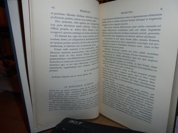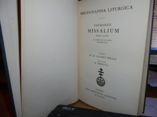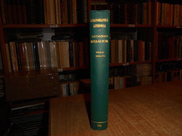 WEALE, IACOBUS. Londini, Apud Bernardum Quaritch, 1928. BIBLIOGRAPHIA LITURGICA. CATALOGUS MISSALIUM Ritus Latini. Ab anno MCCCLXXIV impressum. Iterum editit H. Bohatta. In-8° piccolo, tela coeva con titolo in oro al dorso. xxxii, 380 pp. Ottimo esemplare in edizione originale. Uff. E - IV - 3 - 2