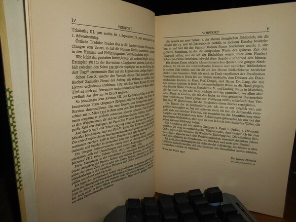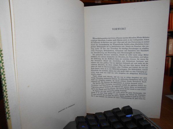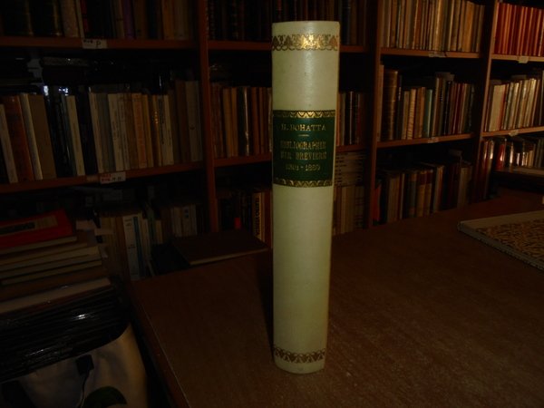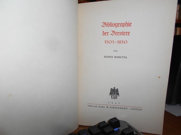 HANNS BOHATTA. Leipzig, Verlag Karl W. Hiersemann, 1937. BIBLIOGRAPHIE der BREVIERE 1501-1850. In-8°, m. pergamena con larghe punte, titolo e fregi in oro al dorso. vii, 349, (3) pp. Perfetto esemplare in splendida legatura. Uff. A - II - 6