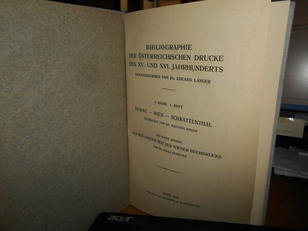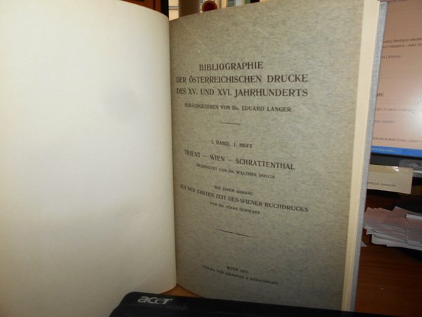 Eduard Langer,Walther Dolch,Ignaz Schwarz. Wien, Verlag Von Gilhofer & Ranschburg, 1913. Bibliographie der österreichischen Drucke des XV. und XVI. Jahrhunderts: 1.1. Trient. Wien. Schrattenthal. Bearbeitet von Dr. Walther Dolch mit einem Anhang ”Aus der ersten Zeit des Wiener Buchdrucks” von Dr. Ignaz Schwarz. In-8°, tela grigia con titolo in oro entro tassello al dorso, copertine originali conservate. vii, (1), 171 pp. con 4 tavole fuori testo. Uff. E - I - 3