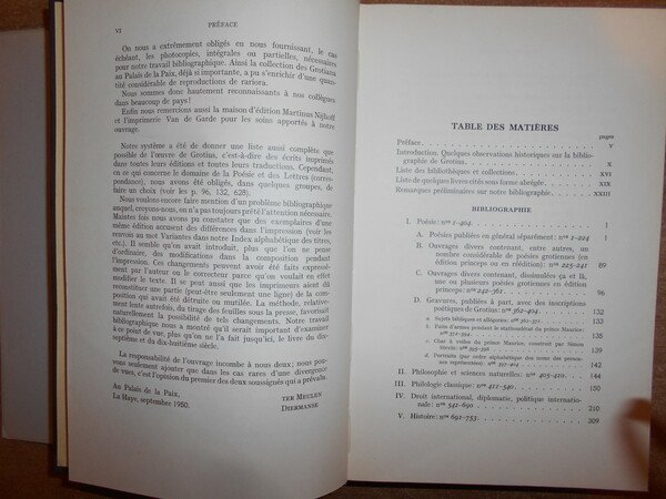 Jacob Ter Meulen. P.J.J. Diermanse. La Haye, Martinus Nijhoff, 1950. Bibliographie des écrits imprimés de HUGO GROTIUS. In-8°, tela e oro, sovracopertina. xxiv, 708 pp. con alcune tavole. Bell' esemplare. Uff. B - III - 1