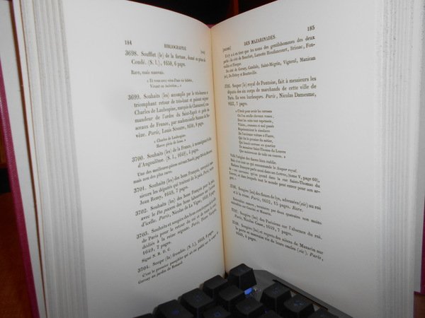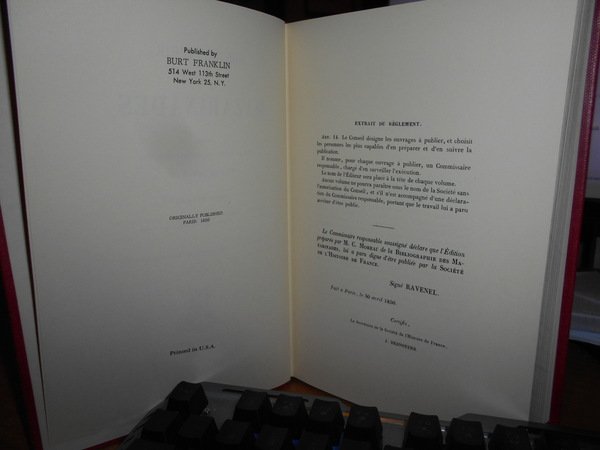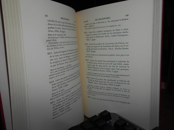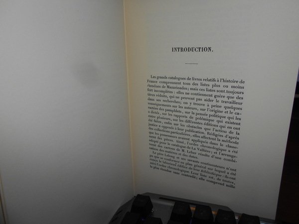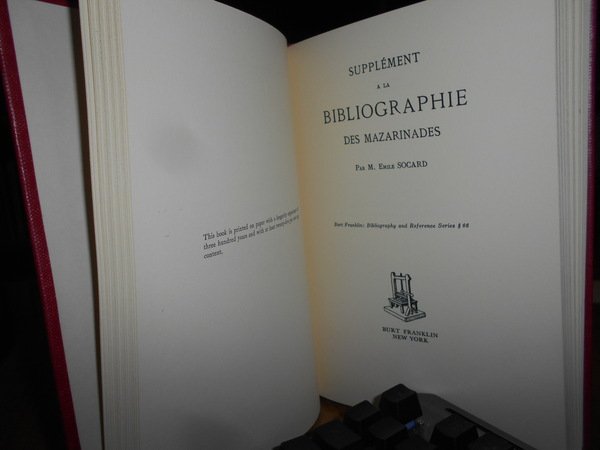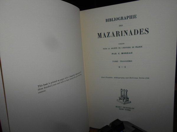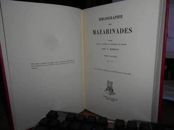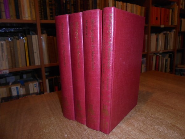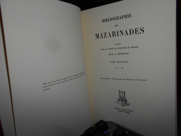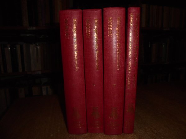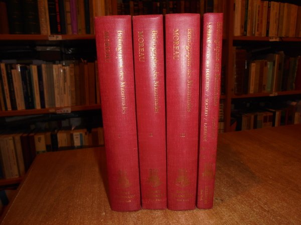 C. MOREAU. New York, Burt Franklin, s.d. (1960). Bibliographie des MAZARINADES Publiée pour la Sociéte de l' Histoire de France. 4 volumi in-8°, tela rossa con titoli in oro ai dorsi. Tome Premier A-F. LXIV, 426 pp.; Tome deuxième G-Q. 398 pp.; Tome troisième R-Z. 464 pp.; Supplements to Moreau's Bibliographie des Mazarinades by Moreau. Ph. van der Haeghen. Emil Soccard. Ernest Labadie. Volume con pagine non numerate. Bell' esemplare. Ristampa dell' edizione di Parigi 1850. Uff. E - III - 4 - 2