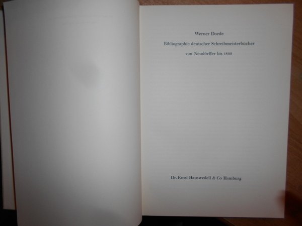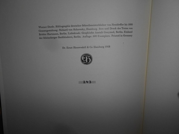 WERNER DOEDE. Hamburg, Dr. Ernst Hauswedell & Co, 1958. Bibliographie deutscher Schreibmeisterbücher von Neudörffer bis 1800. In-4°, tela grigia con titolo al dorso, piano anteriore illustrato. 124, (8) pp. con numerose illustrazioni in 32 tavole fuori testo. Come nuovo in astuccio orig. Edizione tirata in 600 copie (es. n° 243). Uff. E - V - 6