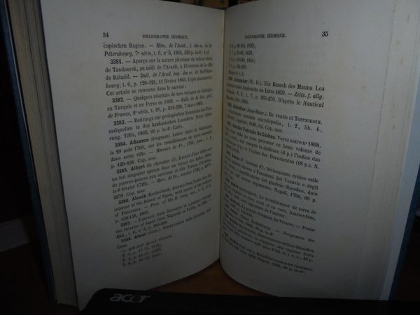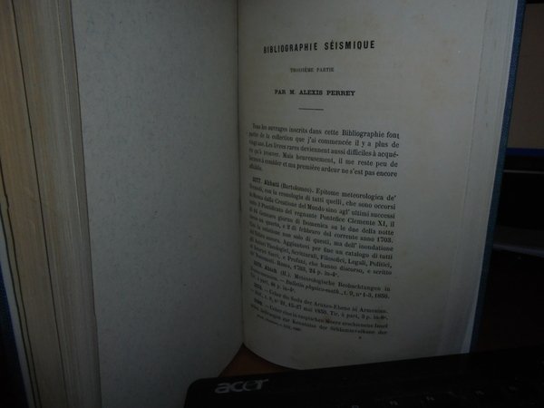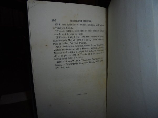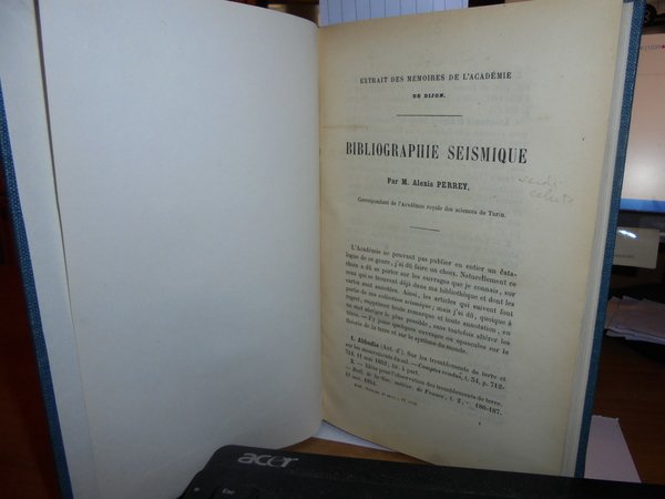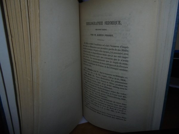 PERREY (ALEXIS). (Dijon, Académie des Sciences et Belles Lettres), 1865 - 1866. BIBLIOGRAPHIE SÉISMIQUE. 3 parti in un volume in-8°, tela verde scura,titolo in oro entro tassello al dorso. 183,161,70 pp. (la terza parte da pagina 33 a pagina 102). Estratti dalle memorie dell'Accademia di Digione, anni 1855-56, 1861-62 e 1865; 4015 numeri descritti in totale. La terza parte è intitolata: Bibliografia sismica. Catalogo di libri, memorie e appunti su terremoti e fenomeni vulcanici. Collezione del signor Alexis Perrey. L'astronomo Alexis Perrey (1807-1882) è uno dei precursori della sismologia statistica e storica; è stato uno dei primi a esplorare le possibili correlazioni tra i terremoti e le stagioni o fasi lunari. Neg. mob. 14 alto.
