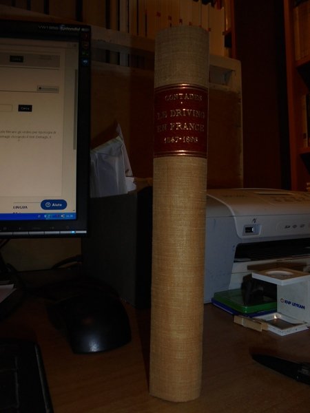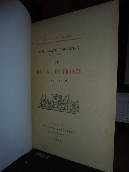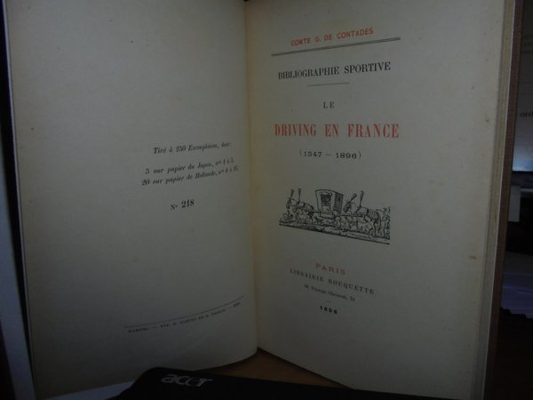 Compte G. De Contades. Paris, Librairie Rouquette, 1898. Bibliographie Sportive. Le DRIVING EN FRANCE (1547-1896). In-8° picc., tela con titolo in oro entro tassello al dorso, copertine originali conservate. xxvii, 208 pp. con tavole fuori testo stampate su cartoncino protette da veline trasparenti. Tiré à 250 Exemplaires, dont: 5 sur papier du Japon, nos 1 à 5. 20 sur papier de Hollande, nos 6 à 25 (n° 218).