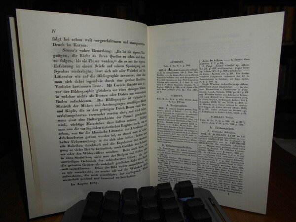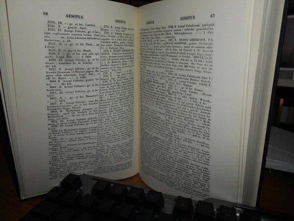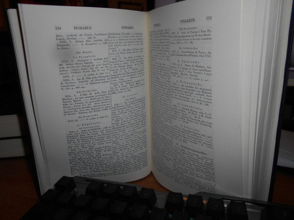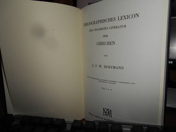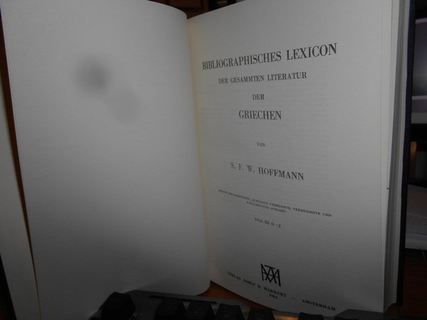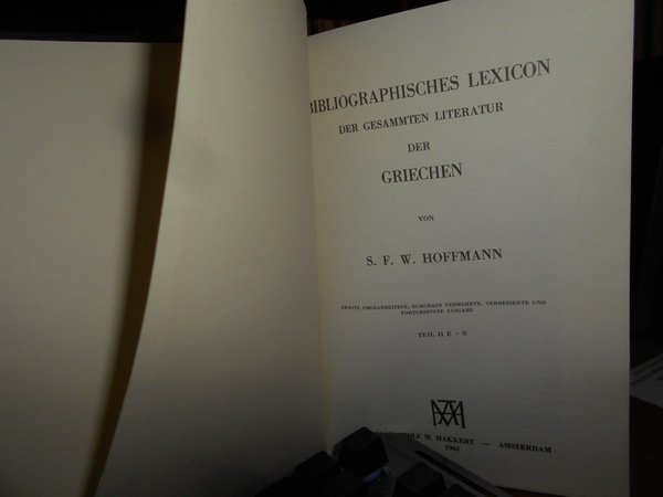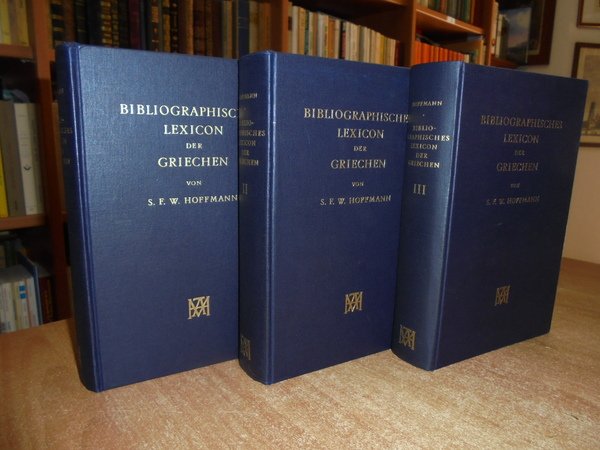 Von S.F.W. HOFFMANN. Amsterdam, Verlag Adolf M. Hakkert, 1961. Bibliographisches Lexicon der GRIECHEN. 3 volumi in-8°, tela bleu con titoli in oro sui piani e ai dorsi. iv, 614 pp.; vi, 649 pp.; 664 pp. Seconda edizione (la prima di Leipzig 1845). Come nuovi. Uff. E - II - 3