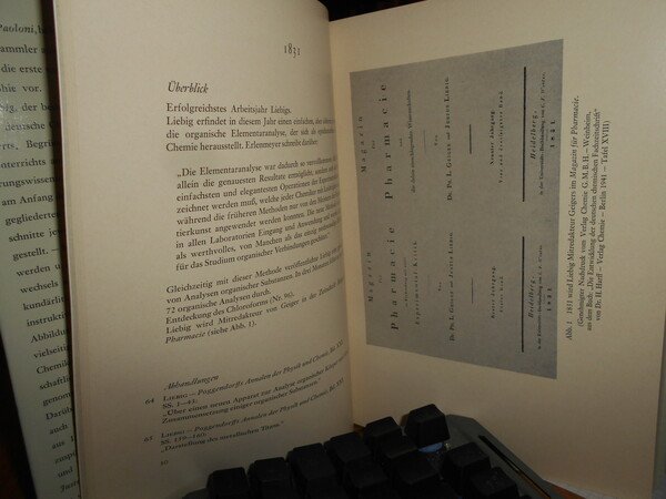 In-8°, mm. 240 x 170. tela editoriale, con sovraccoperta. 332 pp. con ritratto di von Liebig in apertura e 62 illustrazioni e facsimili nel testo.