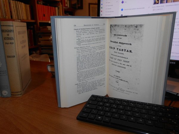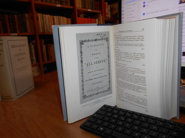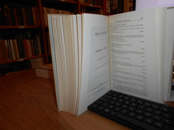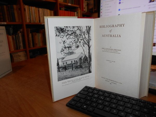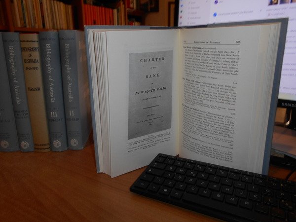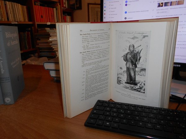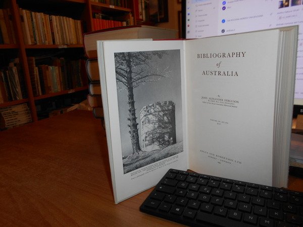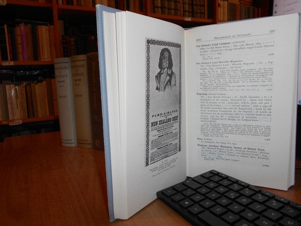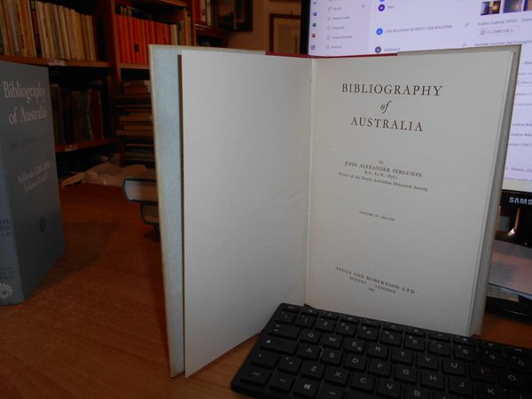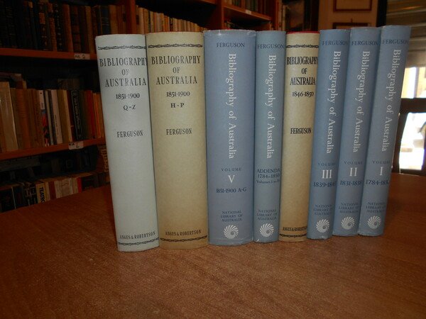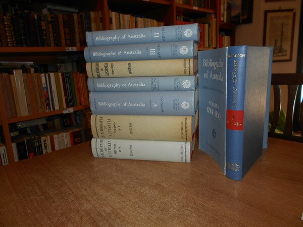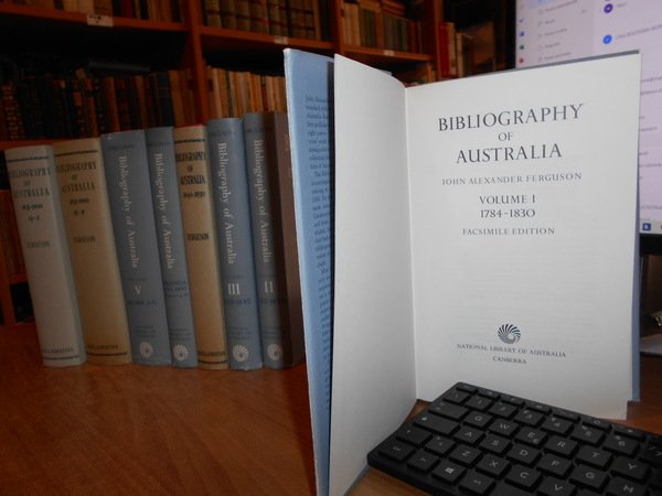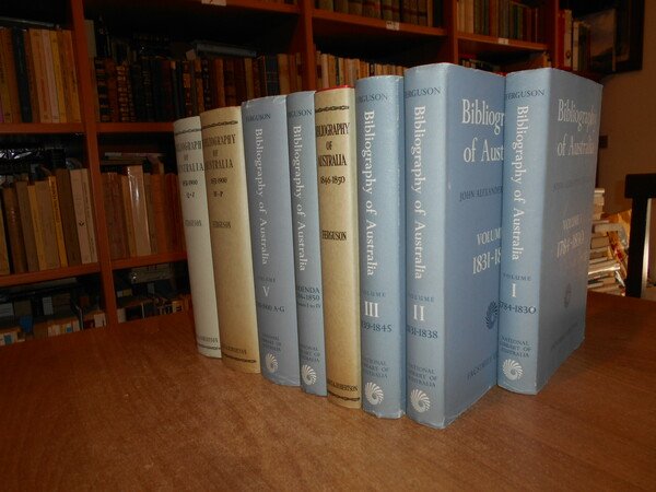JOHN ALEXANDRE FERGUSON. Canberra, National Library of Australia, 1955-1956-1965-1975. Bibliography of Australia. 8 volumi in-8°, tela edit. bleu e rossa, con tutte le sovracopertine. Vol. I. 1784-1830 Facsimile Edition. xii, 540 pp.; Vol. II. 1831-1838 Facsimile Edition. x, 568 pp. + inserto supplementary locations list di 10 pp.; Vol. III. 1839-1845 Facsimile Edition. xii, 632 pp.; Vol. IV. 1846-1850. xii, 732 pp.; Addenda 1784-1850 Volumes I to IV. x, 706 pp.; Vol. V. 1851-1900 A-G. Facsimile Edition. xiv, 1146 pp.; Vol. VI. 1851-1900 H-P. viii, 1141 pp.; Vol. VII. 1851-1900 Q-Z. xii, 1075 pp. Opera completa perfettamente conservata corredata da innumerevoli riproduzioni/illustrazioni n.t. . Uff. B - III - 7 - 2