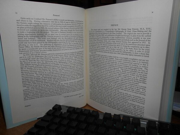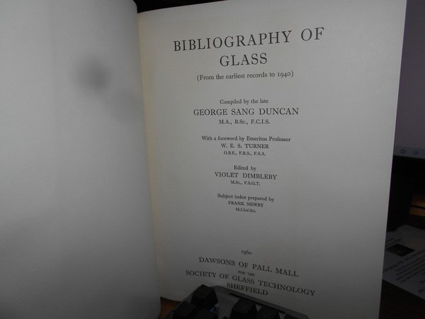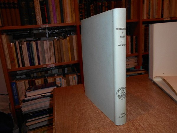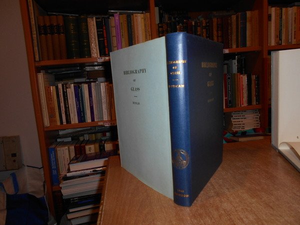 George Sang Duncan. Sheffield, Dawsons of Pall Mall for the Society of Glass Technology, 1960. BIBLIOGRAPHY of GLASS. (From the earliest records to 1940). In-8° grande, tela bleu edit. con titoli in oro sul piano e al dorso, sovracopertina. viii, 544 pp. testo su due colonne. Come nuovo. Uff. D - III - 4