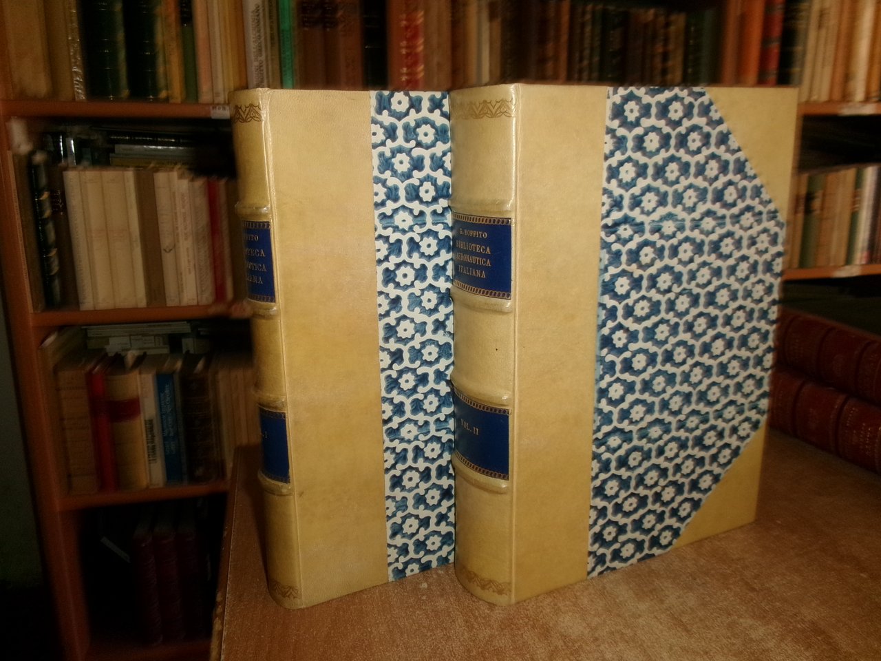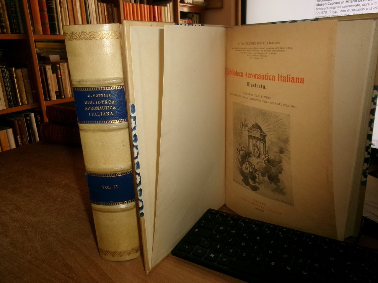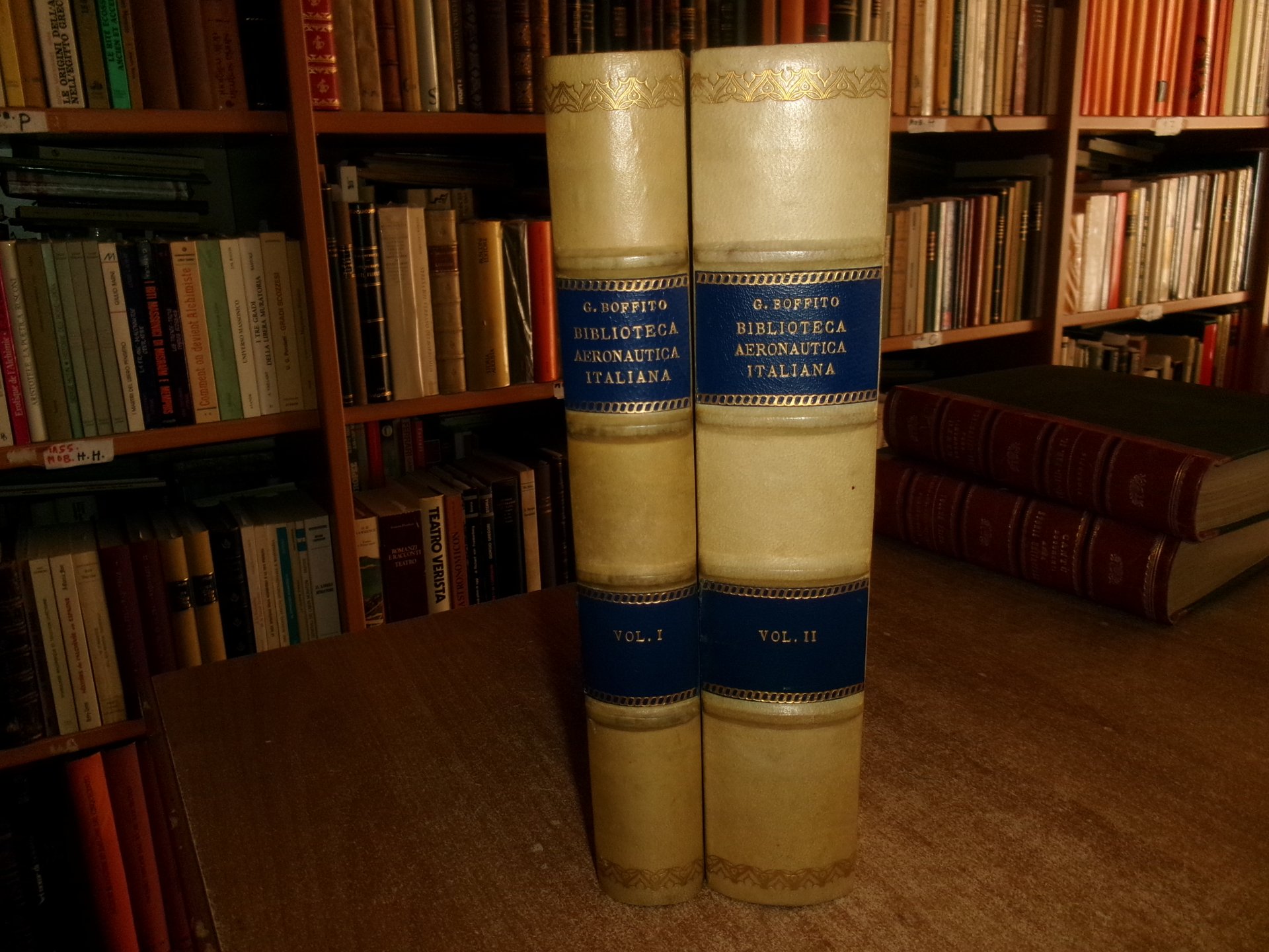 Giuseppe, Boffito Barnabita. Firenze, Leo S. Olschki Editore, 1029 - 1937. Biblioteca Aeronautica Italiana illustrata. Precede uno studio sull' aeronautica nella letteratura nell' arte e nel folklore. Primo supplemento decennale (1927-1936) con aggiunte all' intera <<Biblioteca>> e appendice sui manifesti aeronautici del Museo Caproni in Milano descritti da Paolo Arrigoni. 2 volumi in-4°, m.pergamena coeva con larghe punte, brossure originali conservate, dorsi a 4 nervi con fregi e titoli in oro, segnalibri in cotone. cxv, (1), 544, (4) pp.; vi, (2), 679, (2) pp. con illustrazioni e tavole fuori testo, frontespizi protetti dalle veline trasparenti. Magnifico esemplare come nuovo. Neg. sotto mass.