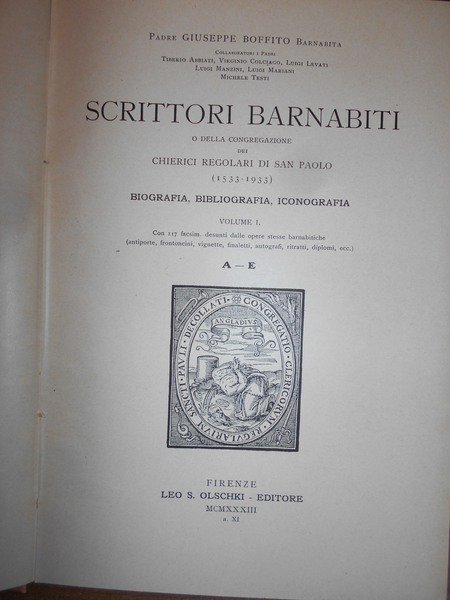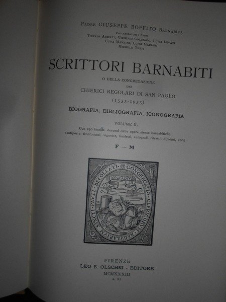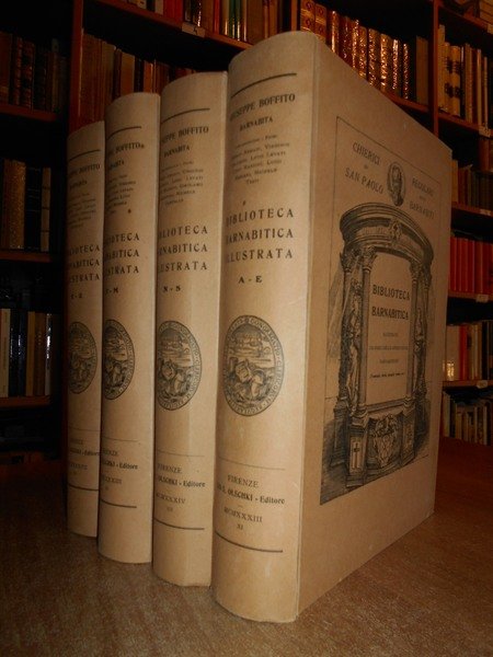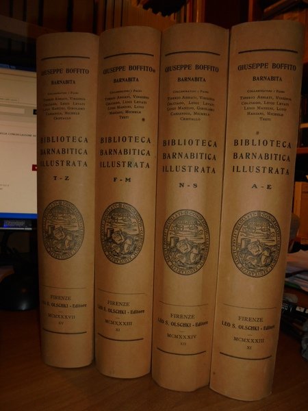 BOFFITO, GIUSEPPE. Firenze, Leo S. Olschki - Editore, 1933. [BIBLIOTECA BARNABITICA ILLUSTRATA COI FREGI DELLE OPERE STESSE BARNABITICHE]. SCRITTORI BARNABITI O DELLA CONGREGAZIONE DEI CHIERICI REGOLARI DI SAN PAOLO (1533-1933). BIOGRAFIA, BIBLIOGRAFIA, ICONOGRAFIA. 4 volumi in-4° (cm. 28,5), legature editoriali in cartonato illustrato; pp. XV 680 con 117 illustrazioni n.t. e f.t.; pp. 633 con 130 illustrazioni n.t. e f.t.; pp. 580 con 134 illustrazioni n.t. e f.t.; pp. 600 con 105 illustrazioni n.t. e f.t. Edizione originale e unica di soli 240 esemplari numerati (ns. n.197), da sempre esaurita presso l'editore. Esemplare come nuovo. Uff. A - II - 7 - 2