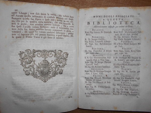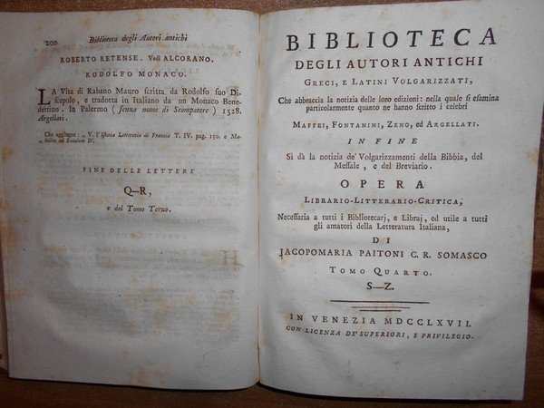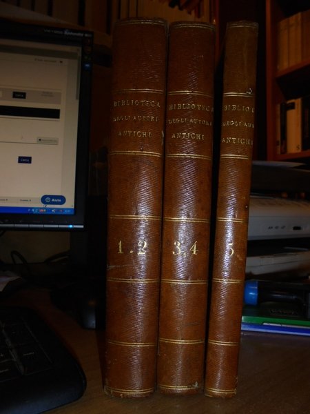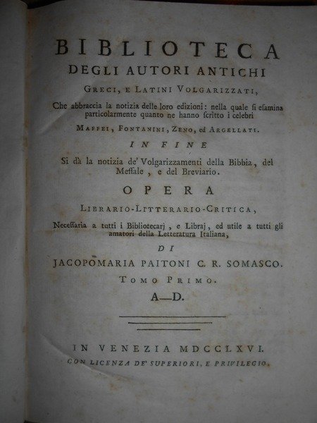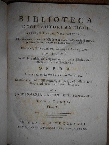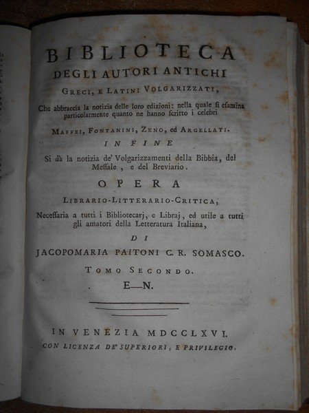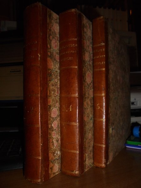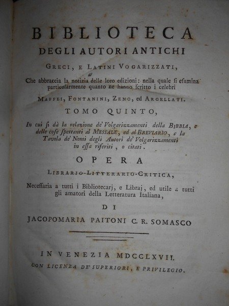Jacopo Maria Paitoni C. R. Somasco. In Venezia, 1766. BIBLIOTECA degli Autori Antichi Greci, e Latini Volgarizzati. In fine si dà notizia de' Volgarizzamenti della Bibbia, del Messale, e del Breviario. 5 tomi legati in tre volumi in-8°, m. pelle coeva con fregi e titoli in oro ai dorsi. 1 f. bianco, (8), 316, viii, 264 pp.; 1 f. bianco, (2), 200, (3), 247 pp., 1 f. bianco.; 1 f. bianco, viii, 271 pp. Arrossature sparse ma esemplare ben conservato. Uff. E- II - 3