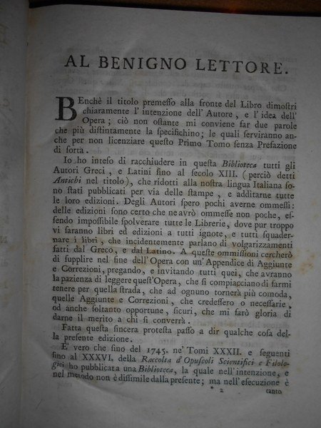 BIBLIOTECA degli Autori Antichi Greci, e Latini Volgarizzati. In fine si dà notizia de' Volgarizzamenti della Bibbia, del Messale, e del Breviario