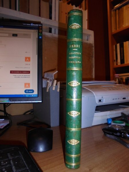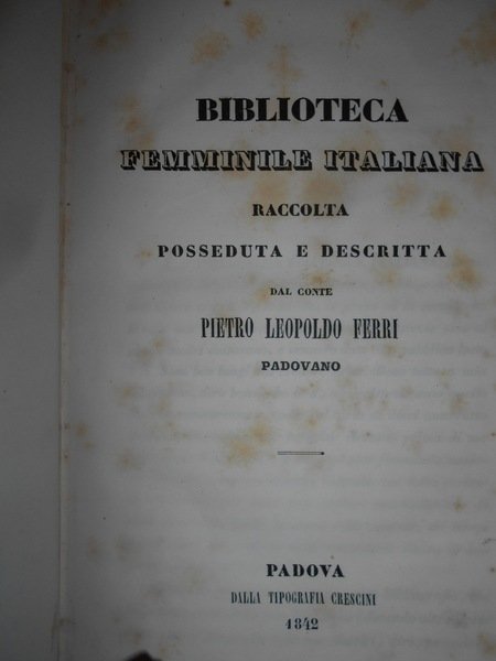 Dal Conte Pietro Leopoldo Ferri. Padova, dalla Tipografia Crescini, 1842. BIBLIOTECA FEMMINILE ITALIANA Raccolta Posseduta e descritta dal Conte Pietro Leopoldo Ferri. In-8°, m. pelle coeva con fregi e titolo in oro al dorso. 411 pp. Rara prima edizione con lievi arrossature dovute alla qualità della carta. Uff. E - II - 6 - 2