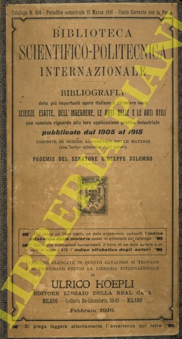 Biblioteca Scientifico-Politecnica Internazionale. Bibliografia delle più importanti opere italiane e straniere sulle Scienze Esatte, dell'Ingegnere, le arti belle e le arti utili con speciale riguardo alla loro applicazione pratica industriale pubblicate dal 1905 al 1915 disposte in ordine alfabetico delle materie (con indice alfabetico degli autori) . Proemio del Senatore Giuseppe Colombo.
