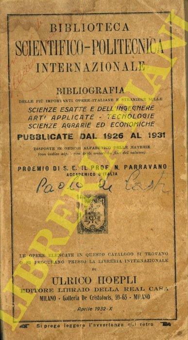 Biblioteca Scientifico-Politecnica Internazionale. Bibliografia delle più importanti opere italiane e straniere sulle Scienze Esatte e dell'Ingegnere, arti applicate, tecnologie, Scinze Agrarie ed Economiche pubblicate dal 1926 al 1931 disposte in ordine alfabetico delle materie (con indice alfabetico degli autori in fine del volume) . Proemio di S.E. il Prof. N.Parravano.