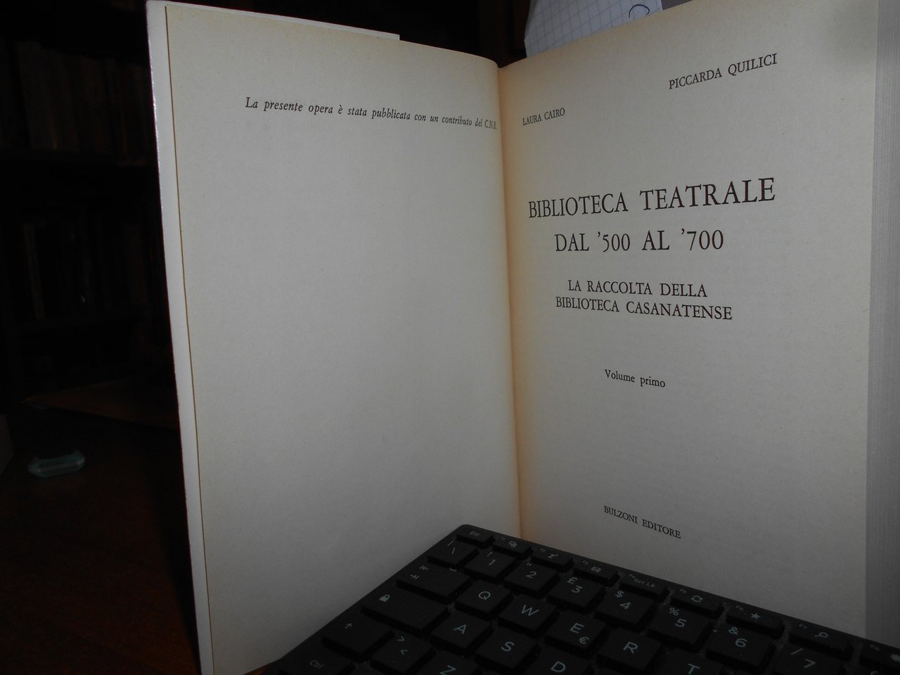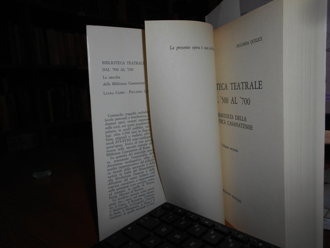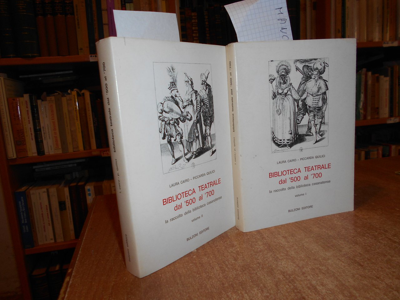 LAURA CAIRO - PICCARDA QUILICI. Roma, Bulzoni editore, 1981. BIBLIOTECA TEATRALE dal '500 al '700. La raccolta della Biblioteca Casanatense. 2 volumi in-8°, br. con sovracopertine per complessive 785 pp. Volumi con lievi segni del tempo ma ottimamente conservati. Uff. mob. A - II - 3