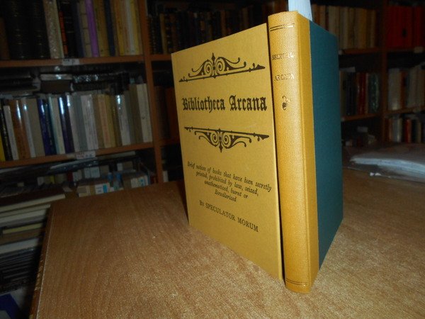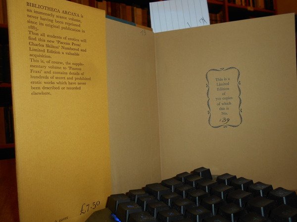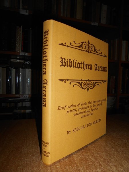 By Speculator Morum. London, George Redway, 1971. Bibliotheca Arcana seu Catalogus Librorum Penetralium. Brief notices of books that have been secretly printed, prohibited by law, seized, anathematised, burnt or Bowdlerised. In-8°, tela con titolo in oro al dorso, sovracoperina. xxii, 141, (1), xxv, (1) pp. Tiratura limitata di 700 copie (n° 139). Come nuovo. Uff. E - IV - 2