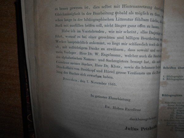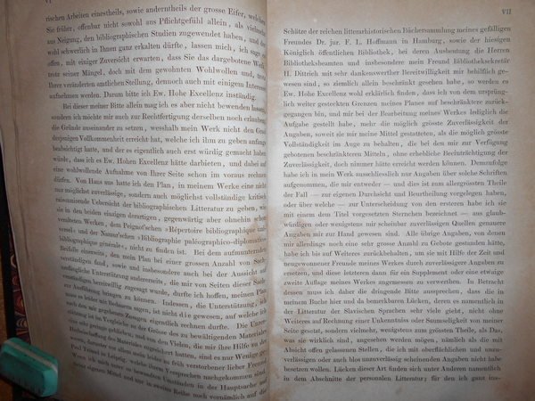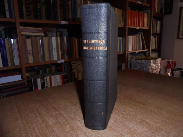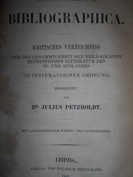JULIUS, PETZHOLDT. Leipzig, Verlag von Wilhelm Engelmann, 1866. BIBLIOTHECA Bibliographica Kritisches Verzeichniss der das gesammtgebiet der Bibliographie betreffenden letteratur des in- und auslandes in systematicher ordnung. In-8°, m. tela con titolo in oro al dorso, tagli marmorizzati. xii, 939 pp. Ottimo esemplare in prima edizione con arrossature in poche pagine. Uff. E - III - 4