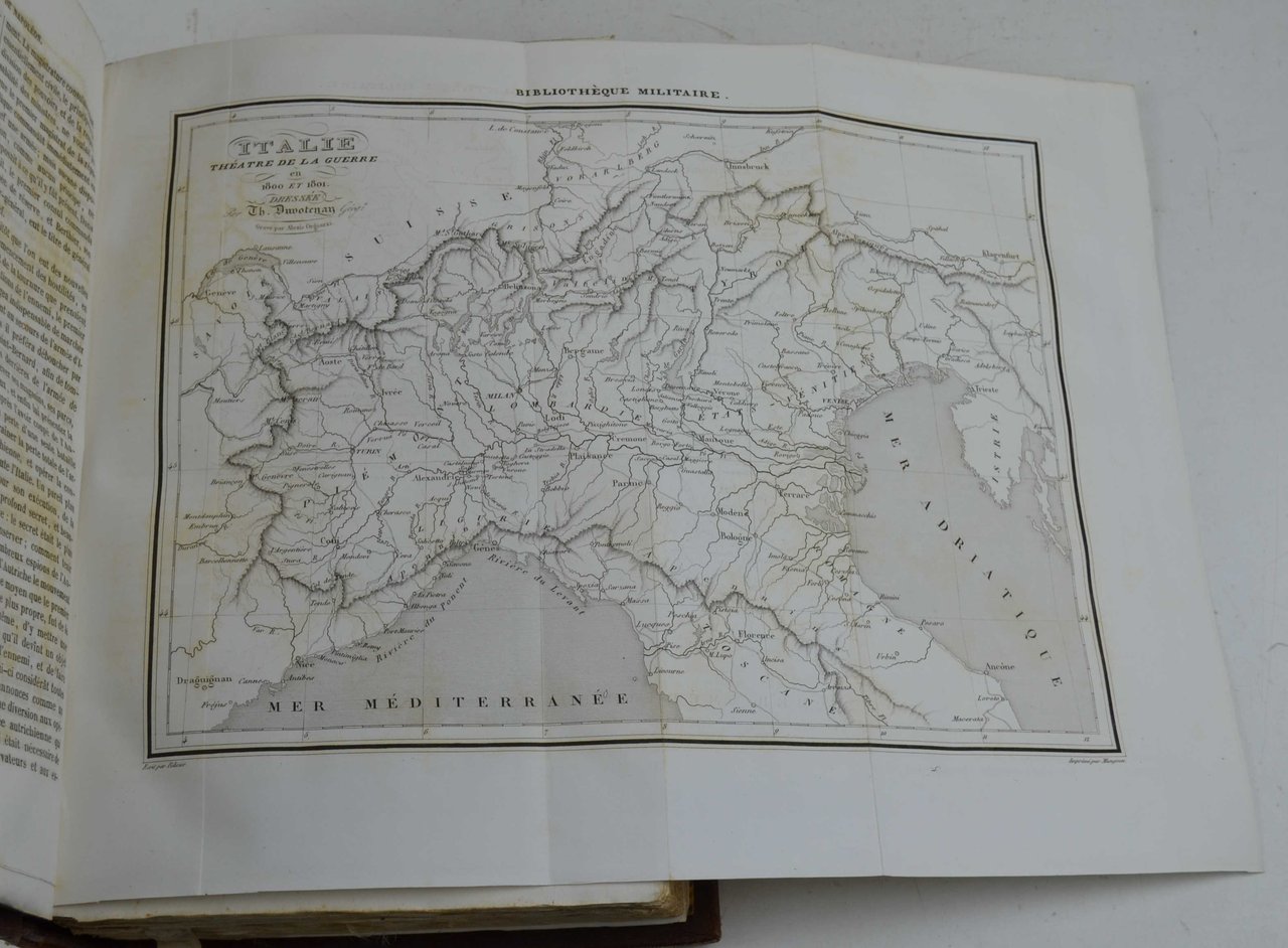 Sei grossi volumi di cm. 27, pp. oltre 5.000 complessive. Con moltissime tavole e carte incise e perlopiù ripiegate fuori testo. Solida ed elegante legatura coeva in piena pelle. Dorsi lisci con titoli e fregi in oro, piatti inquadrati da fregi a secco e filetti in oro. Legatura eseguita a Torino da Francesco Orzese, legatore di S.A.S. il Principe Eugenio di Savoia Carignano. Ex libris nobiliari. Solo qualche fioritura e brunitura sparsa, ma complesivamente esemplare fresco e genuino, marginoso e parzialmente a fogli chiusi. Una vera opera enciclopedica sull'arte militare dall'antichità (tattica dei Greci, Tucudide, Senofonte, ecc.) fino ai tempi moderni (Napoleone).