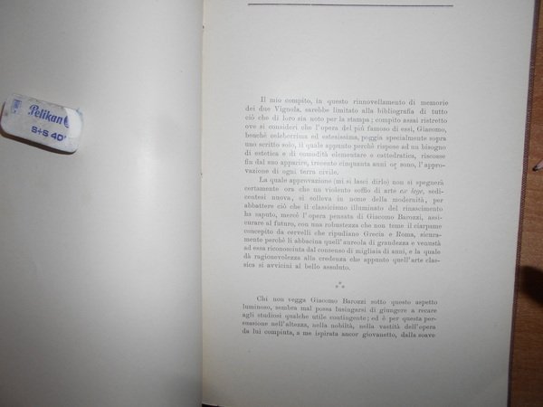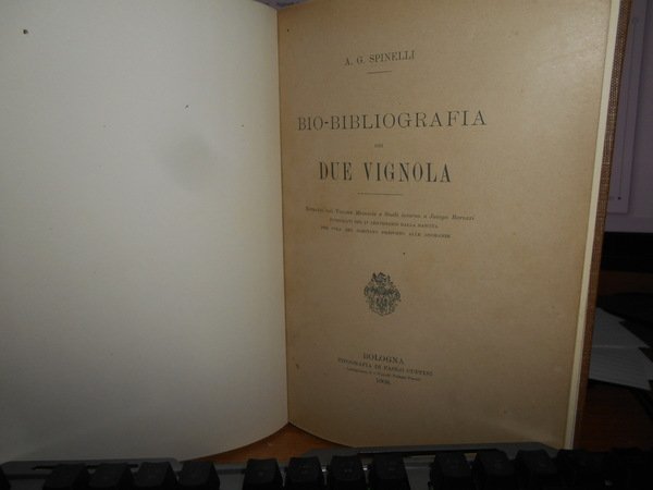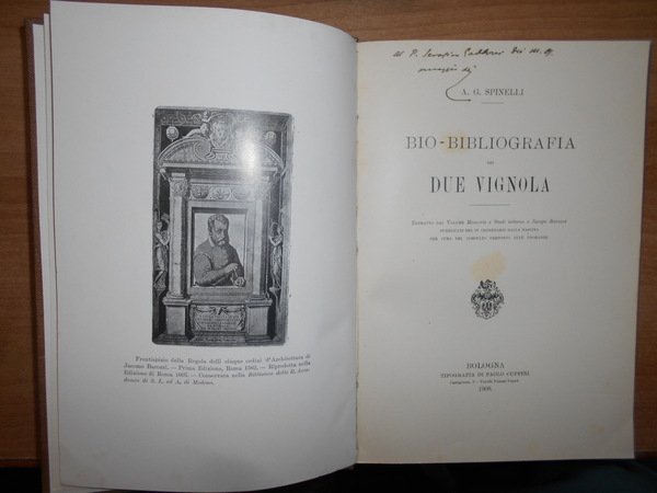 A.G. SPINELLI. Bologna, Tipografia di Paolo Cuppini, 1908. BIO-BIBLIOGRAFIA dei DUE VIGNOLA. In-8°, tela con titolo in oro entro tassello al dorso, copertine originali conservate. 91, (5) pp., con un ritratto del Vignola in apertura. Dettagliata e non comune bibliografia delle numerose edizioni dei due testi principali (e degli scritti minori) del Barozzi da Vignola, importante soprattutto per l'analisi minuziosa delle prime edizioni, le più difficili da identificare. Perfetto esemplare in legatura recente con le copertine originali conservate e dedica non firmata dell' Autore al frontespizio. Neg. mob. rosso