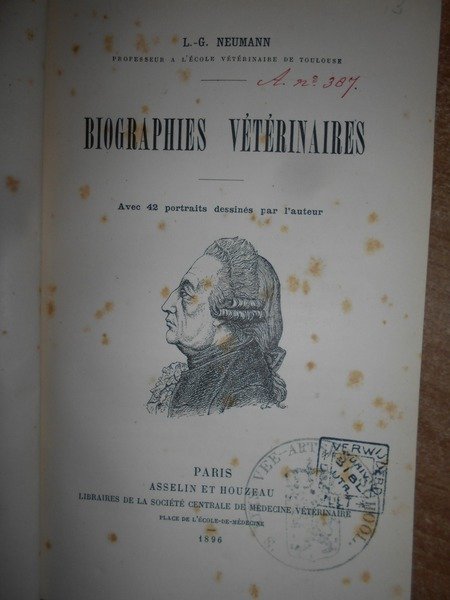 L.-G. NEUMANN. Paris, Asselin et Houzeau, 1896. BIOGRAPHIES Vétérinaires. In-8° piccolo, tela e oro. ix, 443pp. avec 42 portraits dessinés par l' auteur. Lievi fioriture soltanto nelle prime 7-8 pagine ma bell' esemplare. Uff. D - I - 1