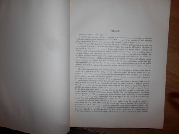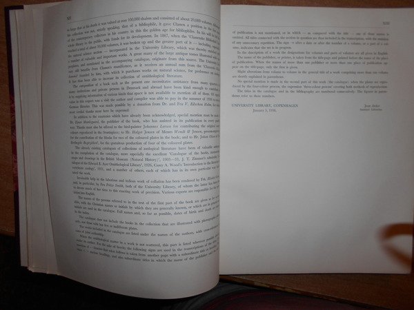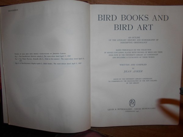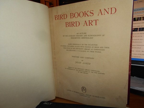 JEAN, ANKER. Copenhagen, Levin & Munksgaard - Ejnar Munksgaard, 1938. BIRD BOOKS AND BIRD ART. An outline of the Literary History and Iconography of descriptive Ornithology. Edizione originale. In-4°, m. marocchino con larghe punte, dorso a nervi con titolo in oro, copertine originali conservate. XVIII, 251 pp. con numerose illustrazioni in tavole fuori testo a colori e in bianco e nero. Perfetto esemplare in legatura di pregio. Uff. D - I - 6