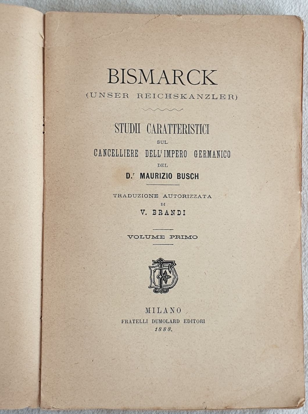 Edizione del 1888 di questa monografia sul politico tedesco Otto Von Bismarck (1815-1898) scritto da Maurizio Busch. Traduzione a cura di Brandi. Siamo in possesso del volume primo solamente. In ottime condizioni. Copertina editoriale in mediocri condizioni generali con usure e parti mancanti ai margini e dorso. Dorso coperto da carta. Legatura in mediocri condizioni con rotture. All'interno le pagine si presentano in ottime condizioni con rare fioriture. Segno di tarlo da pag. 201 alla fine senza perdita di testo. In 8. Dim. 21x14 cm. Pp. XIV+321+(3). Edition of 1888 of this monography about the german politician Otto Von Bismarck (1815-1898) written by Maurizio Busch. Translation by Brandi. Unfortunately we only have the first tome. In very good conditions. Editorial cover in good general conditions with wearings and missing parts in the edges and spine. Spine covered by paper. Binding in poor conditions with cracks. Inside pages are in very good conditions with occasional foxings. Worming from page 201 until the end with no loss of text. In 8. Dim. 21x14 cm. Pp. XIV+321+(3).