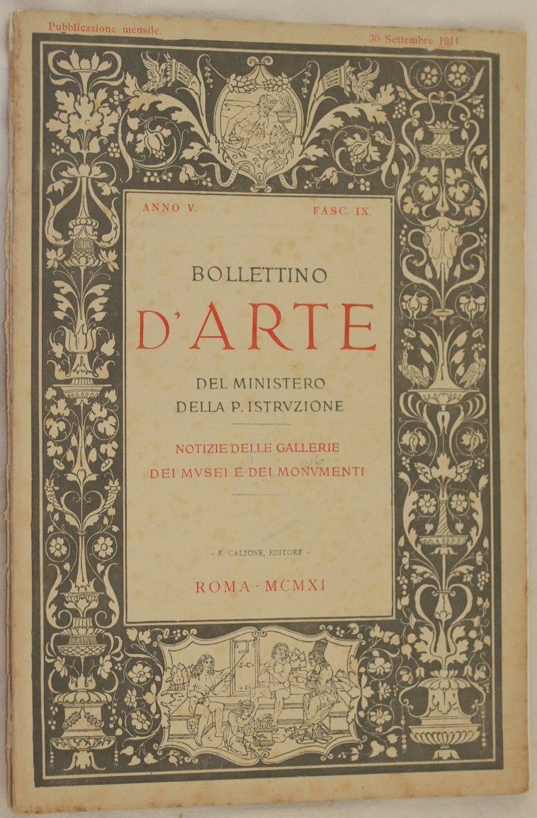In 4. Dim. 31,5x21,5 cm. Pp. da 324 a 364. Bollettino d'arte del 1911 edito dal Ministero della Pubblica Istruzione, solo fascicolo quinto. All'interno: La quadreria civica di Rieti, Tre vasi dipinti del Museo Civico di Schifanoia in Ferrara, Lavori di isolamento delle Terme Dicoleziane In ottime condizioni. Copertina editoriale in discrete condizioni generali con usure e parti mancanti ai margini e dorso. Legatura quasi assente. All'interno le pagine si presentano in ottime condizioni con rare fioriture. Magazome of art of 1911 edited by Ministero della Pubblica Istruzione, fifth pamphlet only.<BR>Inside: La quadreria civica in Rieti, Three painted pots of Museo Civico di Schifanoia in Ferrara, Works of isolation of Terme Dicoleziane In very good conditions. Editorial cover in fair general conditions slightly worn with missing parts in the edges and spine. Binding is almost missing. Pages in very good condiitons with occasional foxings.