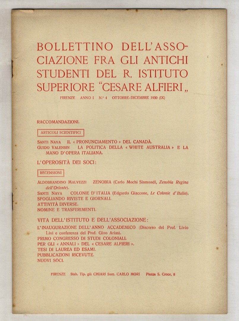 BOLLETTINO dell'Associazione fra gli antichi studenti del R. Istituto Superiore "Cesare Alfieri". Anno primo: 1930: n. 3 (luglio-settembre), n. 4 (ottobre-dicembre). Anno secondo: 1931: n. 3 (luglio-settembre), n. 4 (ottobre-dicembre).