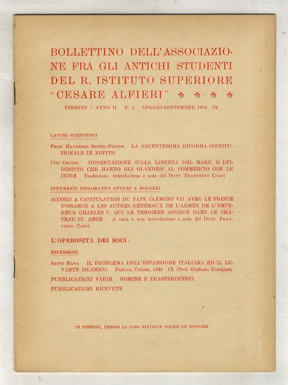 Firenze, presso la Casa Editrice Felice Le Monnier, 1931, in-4, br. editoriale, pp. 22. Testi di Manfredi Siotto-Pintor, Francesco Carfì (la traduzione parziale della "Dissertazione sulla libertà del mare" di Ugo Grozio).